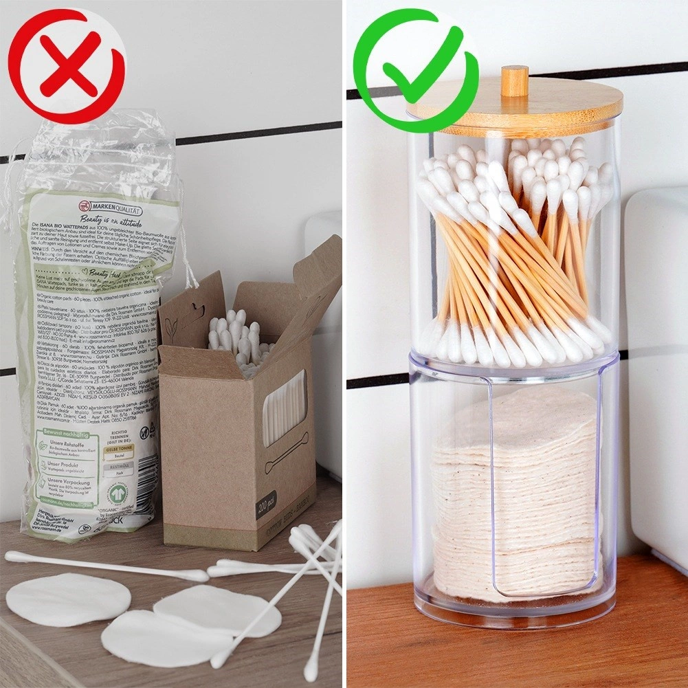 Trennen Sie Wattestäbchen und Pads in einem kompakten Organizer. Das klare Material sorgt für sofortige Übersicht und einen eleganten Look.