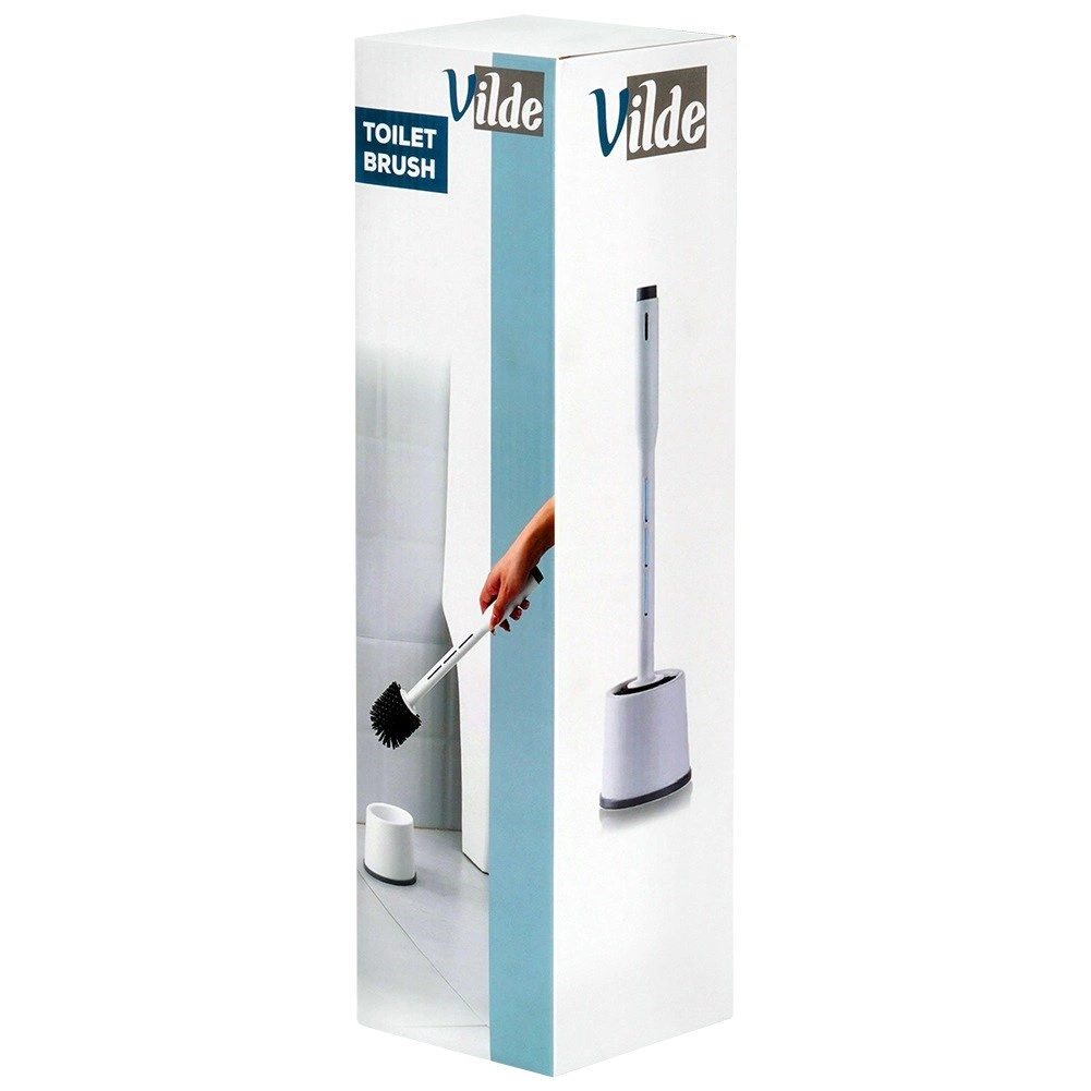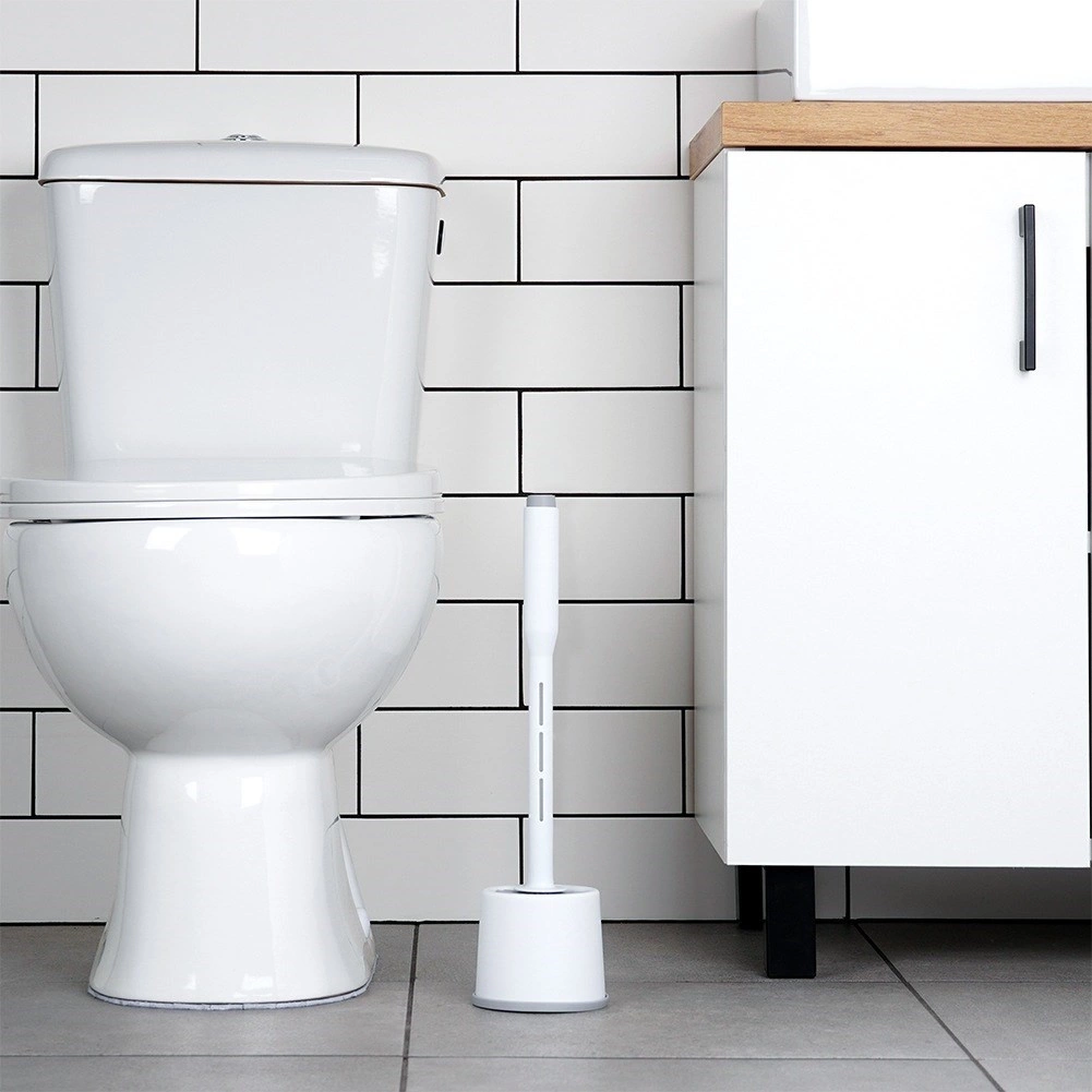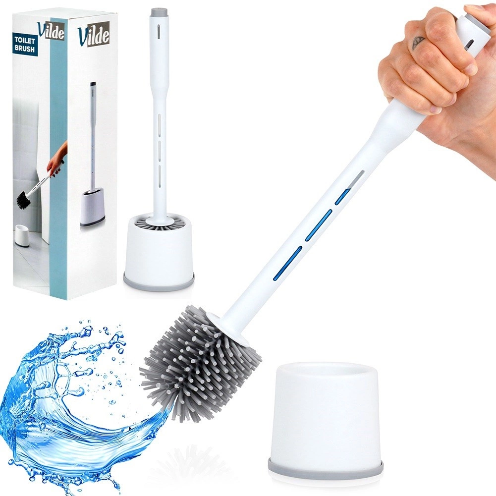 Die dichten Silikonborsten entfernen Schmutz und Kalk wirksam, ohne die Oberfläche der Schüssel zu verkratzen. Der belüftete Ständer mit rutschfestem Boden hält die Bürste aufrecht, beschleunigt das Trocknen und gewährleistet maximale Hygiene sowie eine ansprechende Optik auch im kleinen Bad.