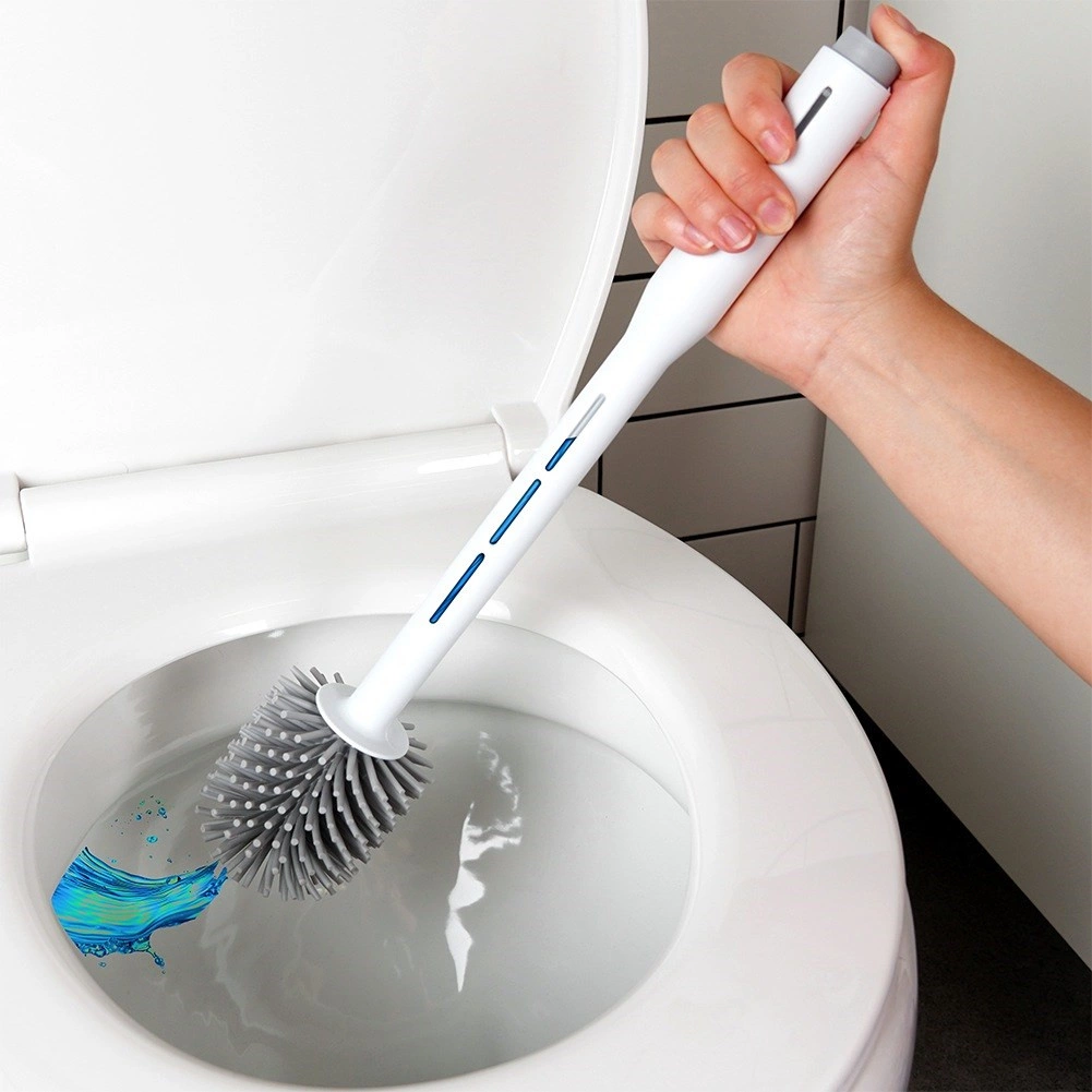 Praktische Silikon-WC-Bürste mit Ständer und integriertem Reinigungsmittelspender im Griff für schnelle und hygienische Reinigung. Dank flexibler Silikonborsten, rutschfester Basis und kompaktem Ständer sorgt sie für gründliches Reinigen ohne Kratzer und sauberes Aufbewahren in jedem Bad.
