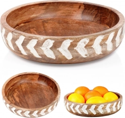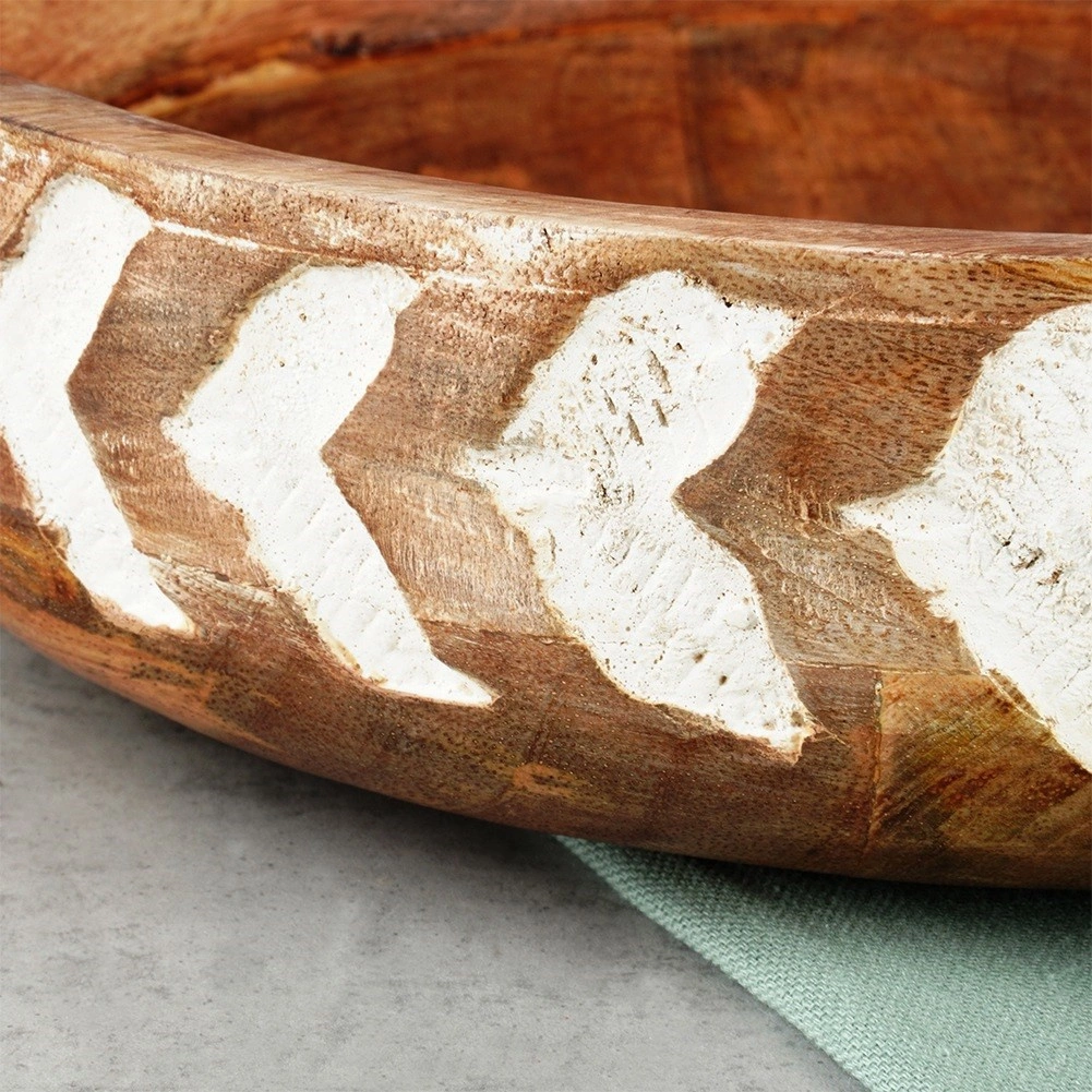 Stilvolle Holzschale aus Mangoholz mit einem Durchmesser von 24 cm und einem Volumen von 1,3 l – ideal zum Servieren von Salaten, Snacks und Obst. Das dekorative, handgeschnitzte weiße Chevron-Muster verleiht der Schale einen rustikalen Charme und einen originellen Look. Mangoholz ist feuchtigkeitsbeständig, trocknet schnell und verzieht sich nicht, was eine lange Lebensdauer und komfortable tägliche Nutzung garantiert.