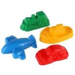 4 Kunststoffförmchen (Zug, Schiff, Flugzeug, Auto)