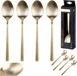Elegantes Set aus vier Teelöffeln aus Edelstahl in mattgoldener Ausführung. Ideal für Kaffee, Tee und Desserts, geeignet für den täglichen Gebrauch und festliches Decken. Pflegeleicht, spülmaschinengeeignet.
