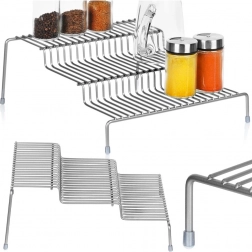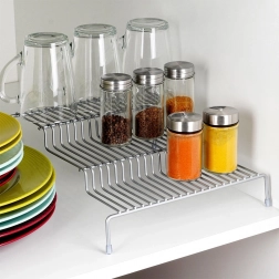 Die dreistufige Regalerhöhung sorgt für bessere Übersicht und sofortigen Zugriff auf gelagerte Dinge – keine versteckten Gewürze oder Tassen mehr im hinteren Teil des Schranks. Die offene Drahtkonstruktion aus widerstandsfähigem Metall ist stabil, luftig und leicht zu pflegen.