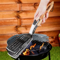 Dieses robuste Grillwerkzeug kombiniert die Vorteile eines Wenders und einer Zange in einem. Die 40 cm lange Konstruktion sorgt für sicheren Abstand zur Hitze, während der perforierte Edelstahlkopf Fett und Säfte effektiv ableitet – für ein knuspriges und gleichmäßig gegartes Ergebnis. Der ergonomische Holzgriff bietet einen sicheren und komfortablen Halt.