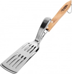 Praktischer Grillwender und Zange 2-in-1 aus Edelstahl mit Holzgriff und perforiertem Kopf für einfaches Wenden, Servieren und den Abfluss von überschüssigem Fett. Dank des Klemmmechanismus gelingt alles bequem mit einer Hand – ideal für Fleisch, Gemüse, Burger und Fisch.