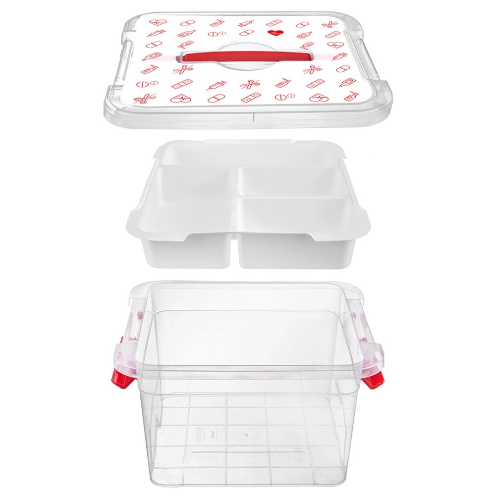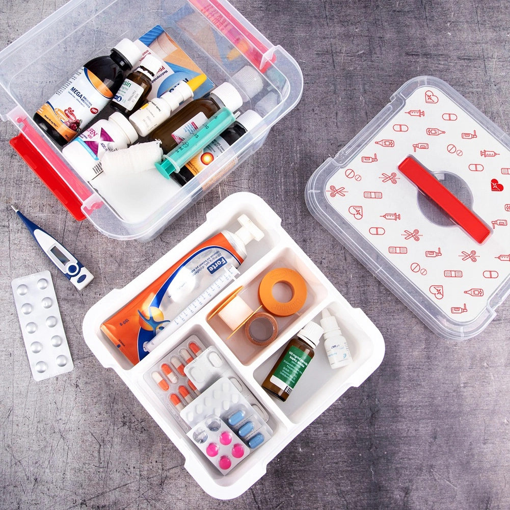 Die Box besteht aus robustem Kunststoff mit stabilen Clipverschlüssen und ergonomischem Griff für sicheren Transport. Der Deckel mit roten Icons (Tabletten, Thermometer, Spritzen, Fläschchen, Pflaster) weist klar auf die Bestimmung hin – Hausapotheke. Geeignet für Haushalte, medizinische Einrichtungen, Apotheken und Seniorenheime.