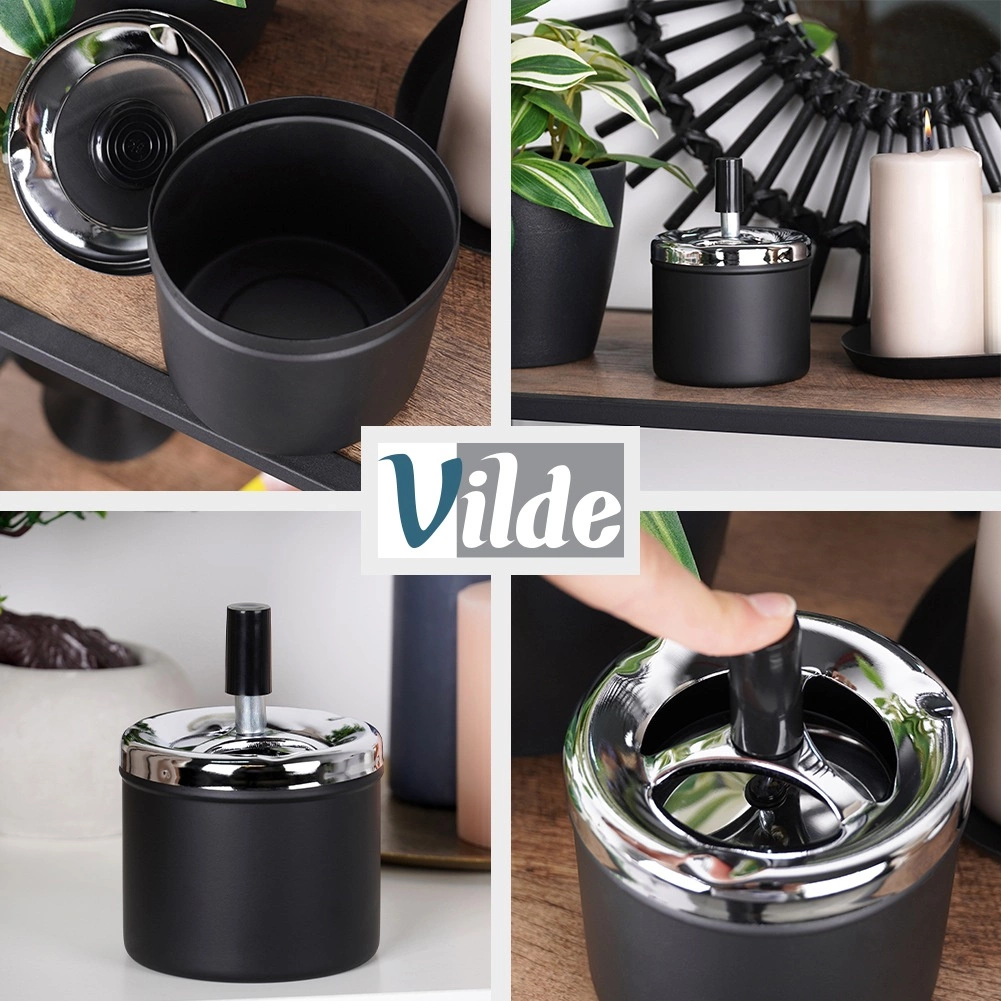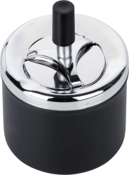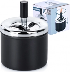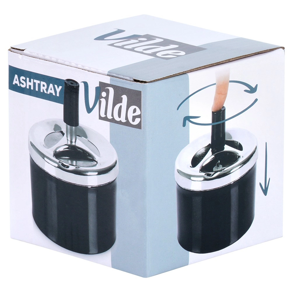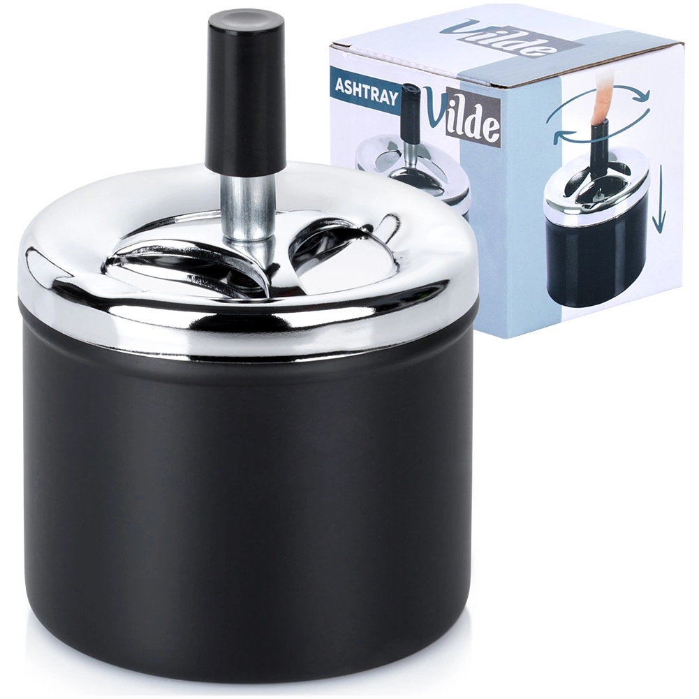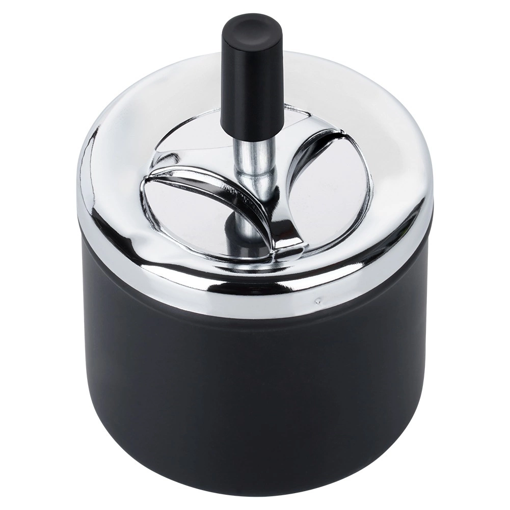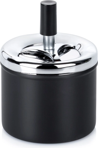 Dieser verschließbare Aschenbecher verbindet modernes Design mit funktionaler Ausführung. Der drehbare Deckel verbirgt Zigarettenreste und hilft, unangenehme Gerüche innen zu halten. Dank des hochwertigen Metalls in Mattschwarz und des silbernen Deckels wirkt er elegant im Innen- wie Außenbereich.