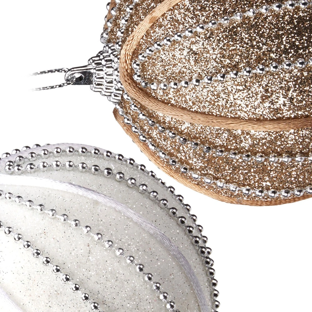 Verleihen Sie Ihrer Weihnachtsdekoration einen strahlenden, modernen und zugleich zeitlosen Look. Das Set aus 12 Stück in der Kombination aus Weiß und Champagnergold reflektiert das Licht wunderschön und schafft eine festliche Atmosphäre. Die Oberfläche mit feinem Brokat und der detaillierten Perlendekoration wirkt luxuriös und elegant.