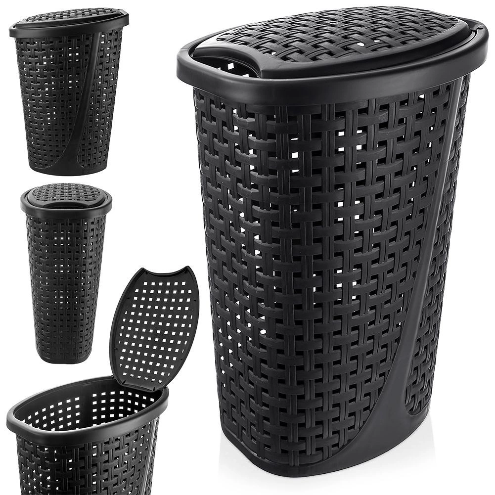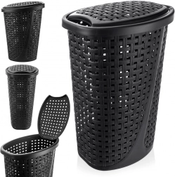 Praktischer Wäschekorb mit 45 l Fassungsvermögen und verschließbarem Deckel in elegantem Schwarz. Dank der schmalen Form, der belüfteten Rattan-Optik und des leichten, aber robusten Kunststoffs passt er perfekt neben die Waschmaschine und in kleinere Bäder. Integrierte Griffe, atmungsaktive Perforationen zur Geruchsreduzierung und das leicht zu öffnende Deckel sorgen für komfortable Nutzung im Alltag.