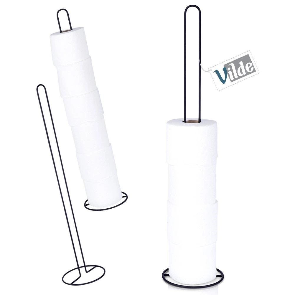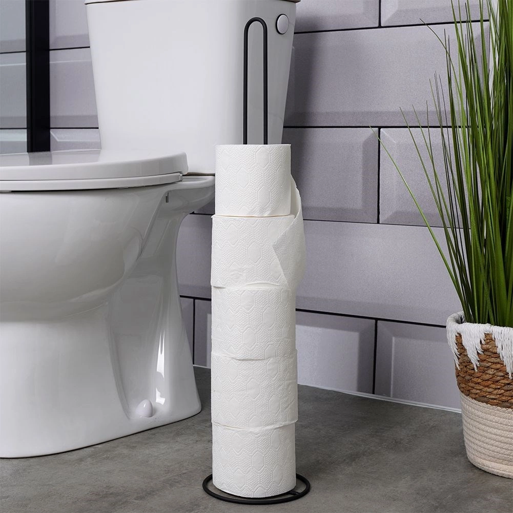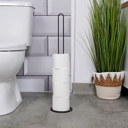 Freistehender Toilettenpapierständer im minimalistischen Design vereint Praktikabilität und Stil. Die schlanke Konstruktion mit Griff ermöglicht bequemes Umstellen und schnelles Nachfüllen der Rollen. Die matte schwarze Oberfläche harmoniert perfekt mit moderner Sanitärkeramik und Accessoires.