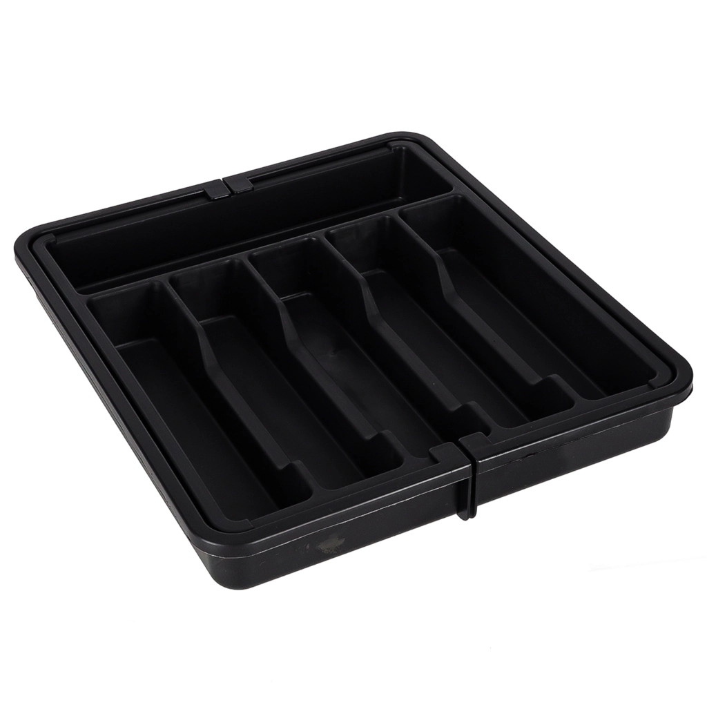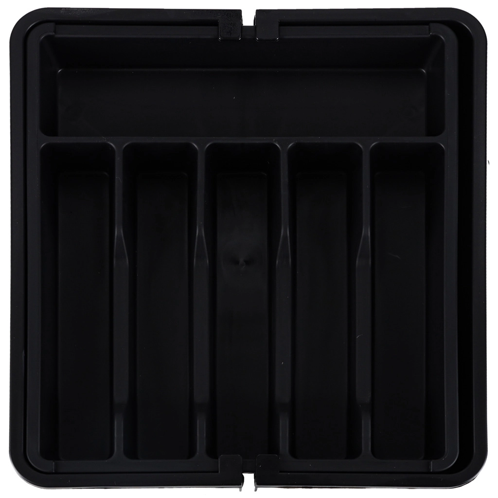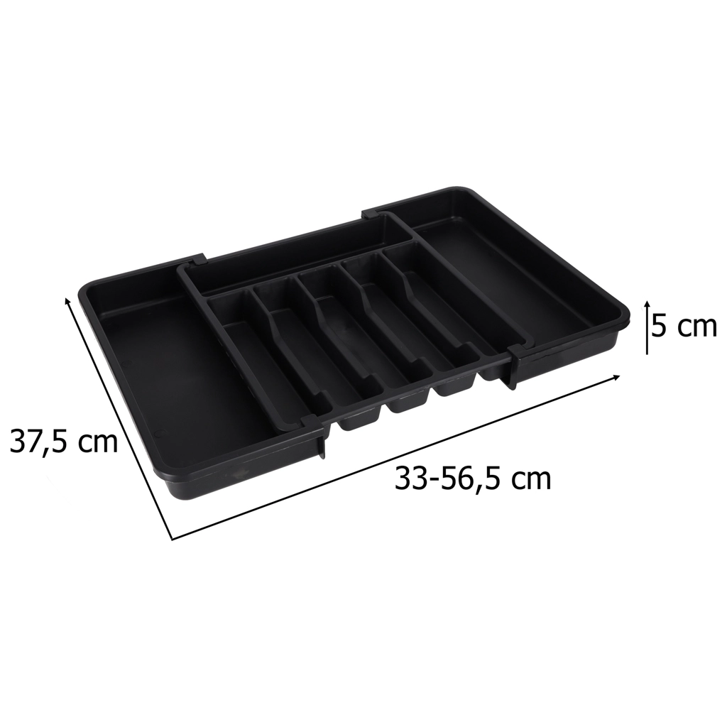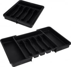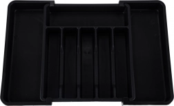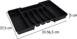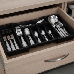 Die moderne, modulare Einsatzlösung für Küchenschubladen hilft, den verfügbaren Platz maximal zu nutzen. Die ausziehbare Konstruktion ermöglicht eine präzise Breitenanpassung, sodass der Organizer perfekt in schmale wie breite Schubladen passt. Das elegante schwarze Design und die glatten Oberflächen sind pflegeleicht und verleihen der Küche ein einheitliches Erscheinungsbild.