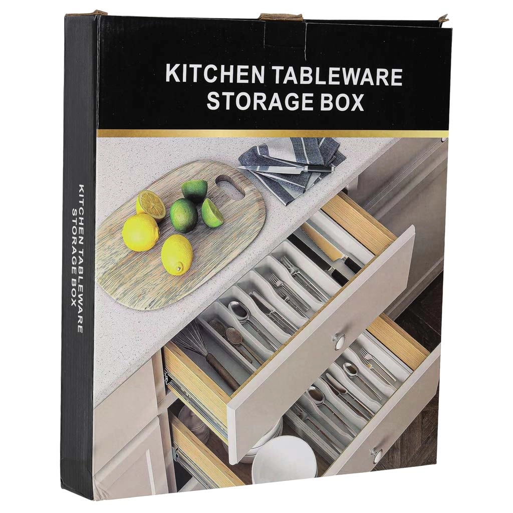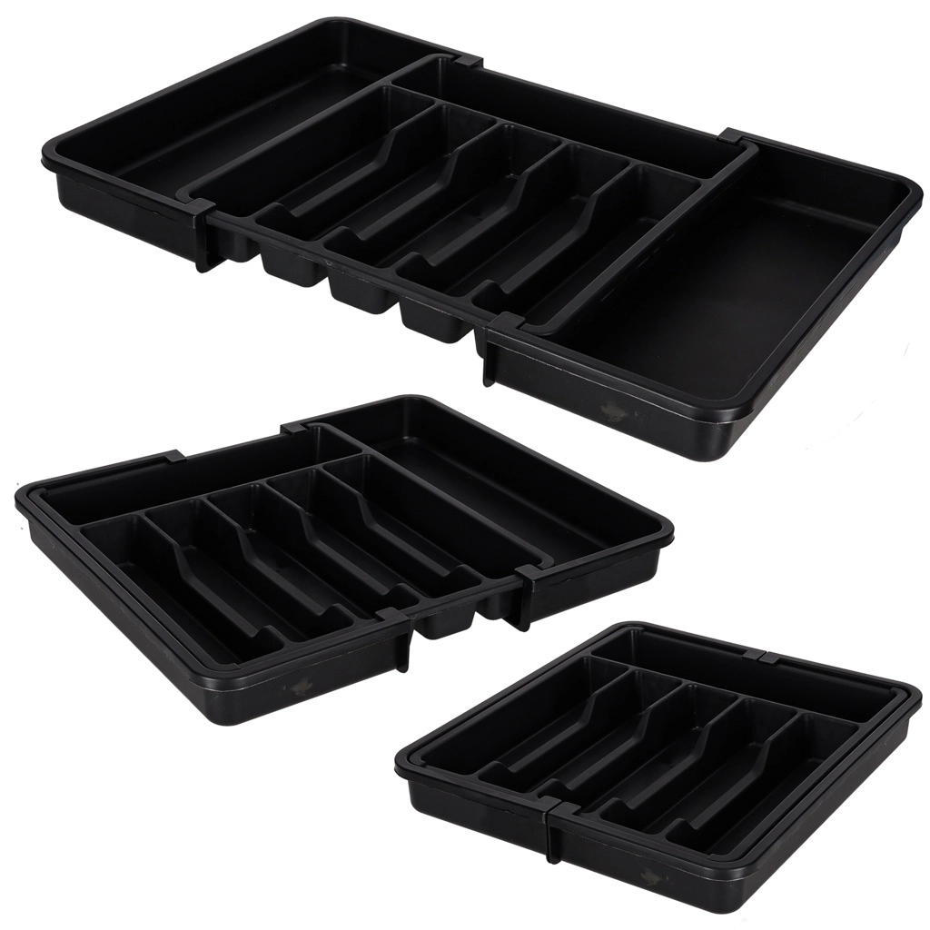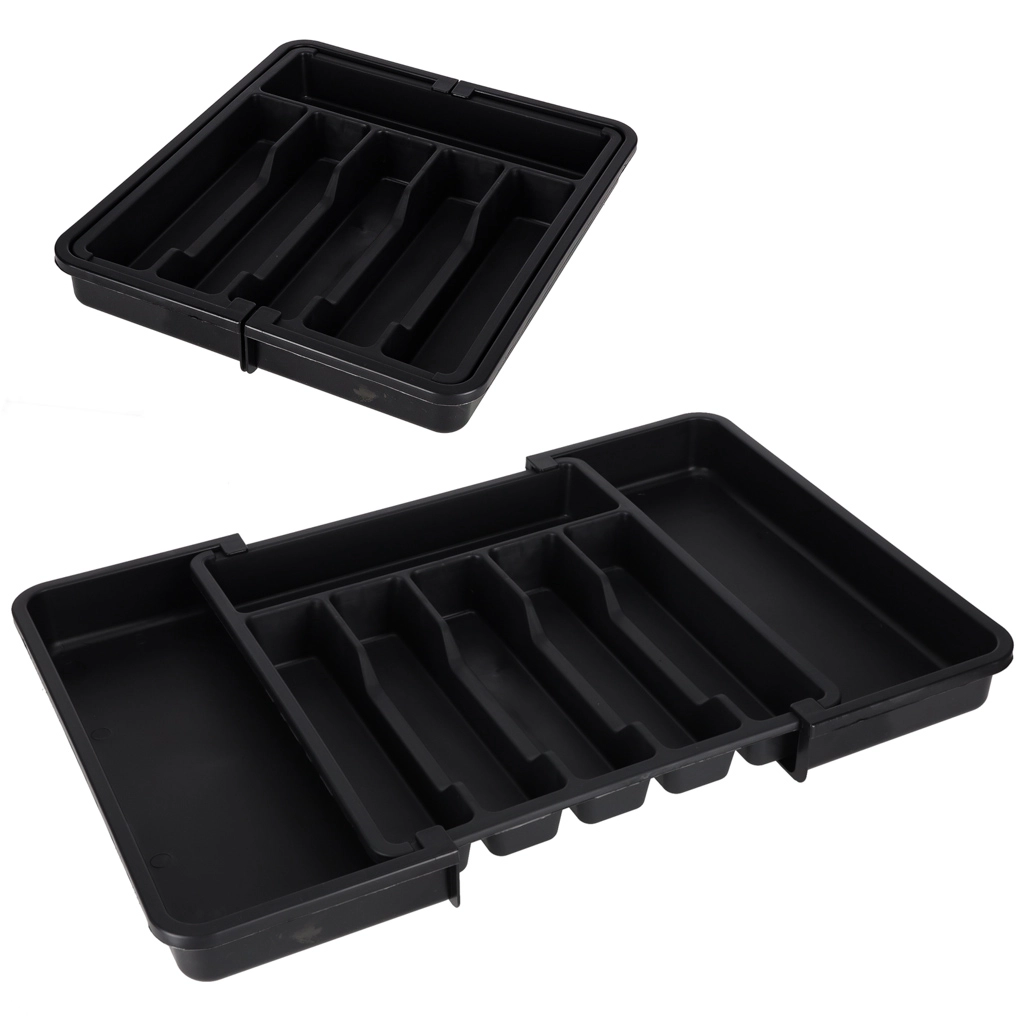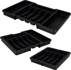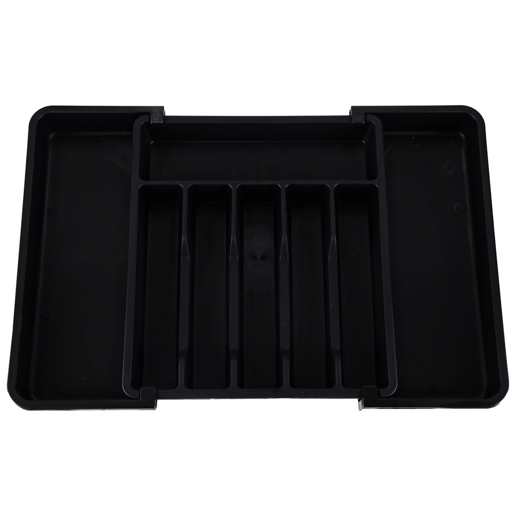 Die moderne, modulare Einsatzlösung für Küchenschubladen hilft, den verfügbaren Platz maximal zu nutzen. Die ausziehbare Konstruktion ermöglicht eine präzise Breitenanpassung, sodass der Organizer perfekt in schmale wie breite Schubladen passt. Das elegante schwarze Design und die glatten Oberflächen sind pflegeleicht und verleihen der Küche ein einheitliches Erscheinungsbild.