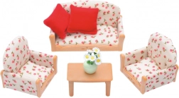 Der Lieferumfang umfasst ein Sofa, zwei Sessel, einen Couchtisch mit abgestimmtem Design und eine dekorative Vase mit frisch gepflückten Margeriten. Zwei leuchtend rote Kissen setzen einen markanten Farbakzent und sorgen für Komfort beim Spielen.