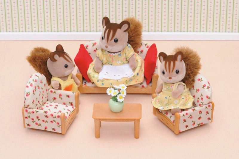Gestalten Sie ein gemütliches sylvanisches Wohnzimmer mit einer stilvollen Sitzgarnitur, die romantisches Blumendesign mit detaillierten, holzimitierenden Rahmen kombiniert. Das Set ist ideal für SYLVANIAN FAMILIES Häuser und Spielszenerien und lässt sich leicht mit weiteren Sets und Zubehörteilen kombinieren.