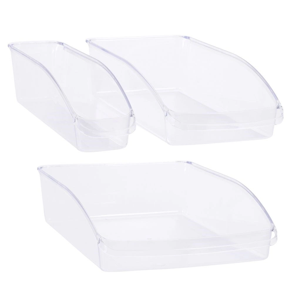 Hohe Seitenwände halten Flaschen, Gläser und Dosen stabil an ihrem Platz. Drei Größen erleichtern die Unterteilung von Lebensmitteln und die maximale Raumnutzung.