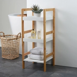 Stilvolles dreistöckiges Regal aus Bambusholz und MDF überzeugt durch natürliche Optik und funktionale Ausführung. Geeignet fürs Badezimmer, aber auch ideal in Küche, Speisekammer, auf dem Balkon oder der Terrasse. Dank der kompakten Maße 30 × 30 × 72 cm passt es selbst in kleinere Räume und bietet ausreichend Platz für Alltagsgegenstände.