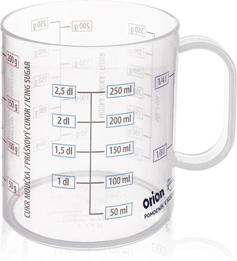 Praktischer Küchenmessbecher in Form einer Tasse mit 250 ml Volumen für präzises Abmessen von trockenen und flüssigen Zutaten. Dank der gut lesbaren Skala in l, ml und g messen Sie Mehl, Zucker, Reis, Salz und Flüssigkeiten mühelos ab. Leichtes und robustes Material ist lebensmittelsicher, der ergonomische Griff sorgt für komfortable Handhabung und die Spülmaschinentauglichkeit erleichtert die Pflege.
