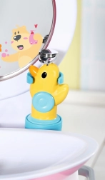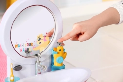 Das unterhaltsame BABY born Puppenwaschbecken macht tägliche Hygiene zum Spiel. Beim Drücken der Taste leuchtet der Spiegelrand auf und es startet eine Melodie als Timer zum Händewaschen. Ein Seifenspender, fließendes Wasser beim Drücken des Hahns und ein Enten-Stöpsel sorgen für ein realistisches Spielerlebnis. Enthalten sind eine Zahnbürste, ein Becher mit Zahnputzgeräuschen und ein Handtuch.