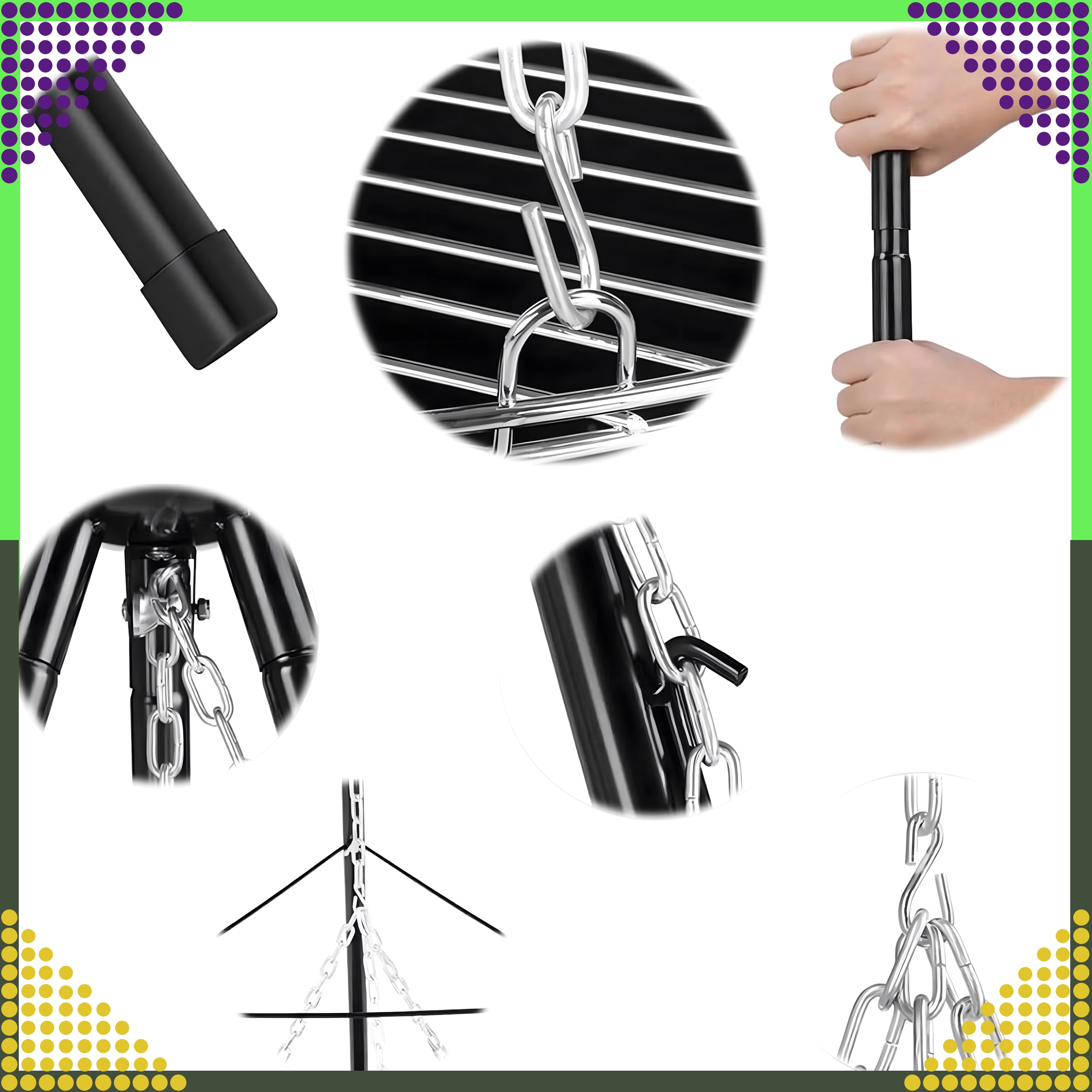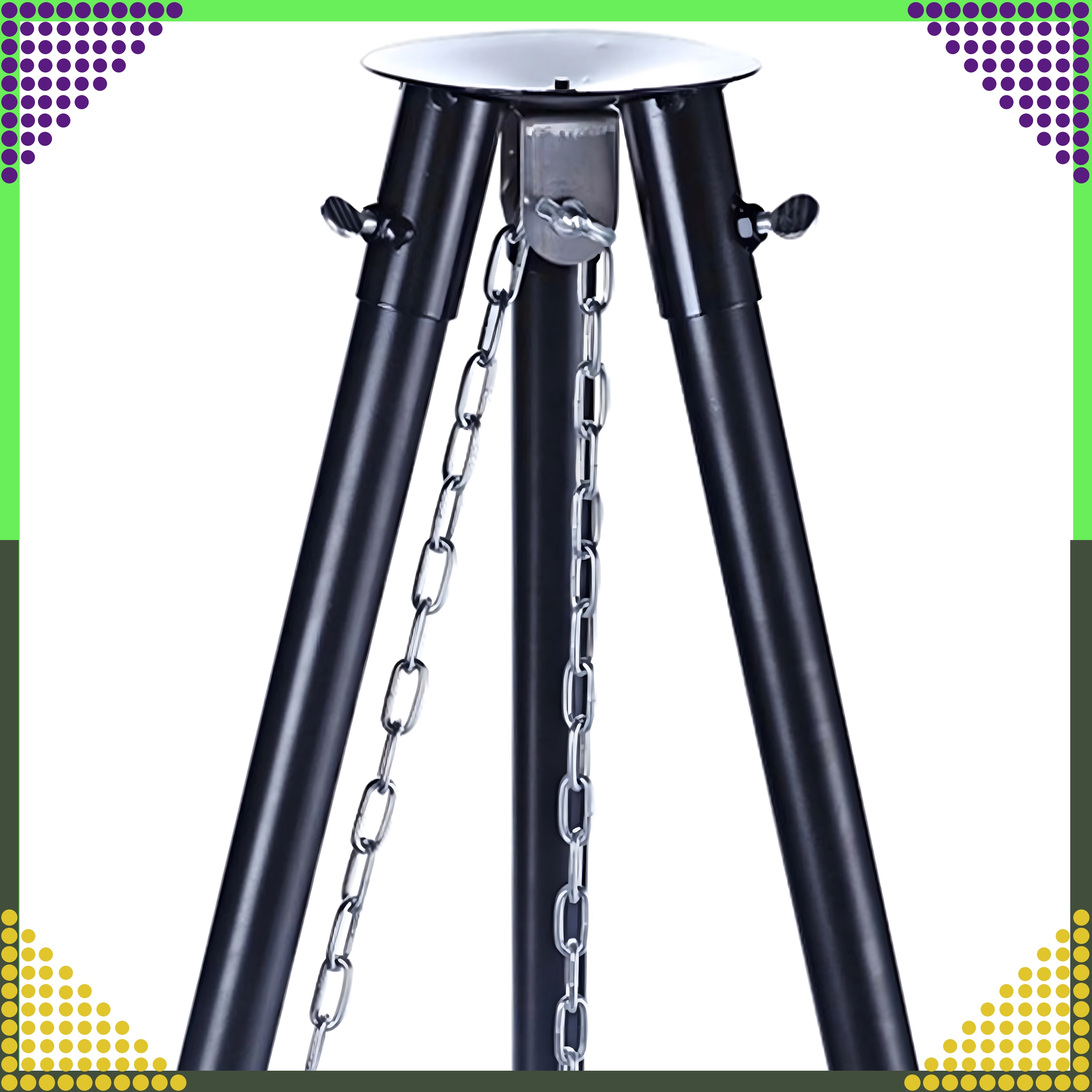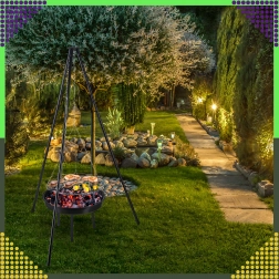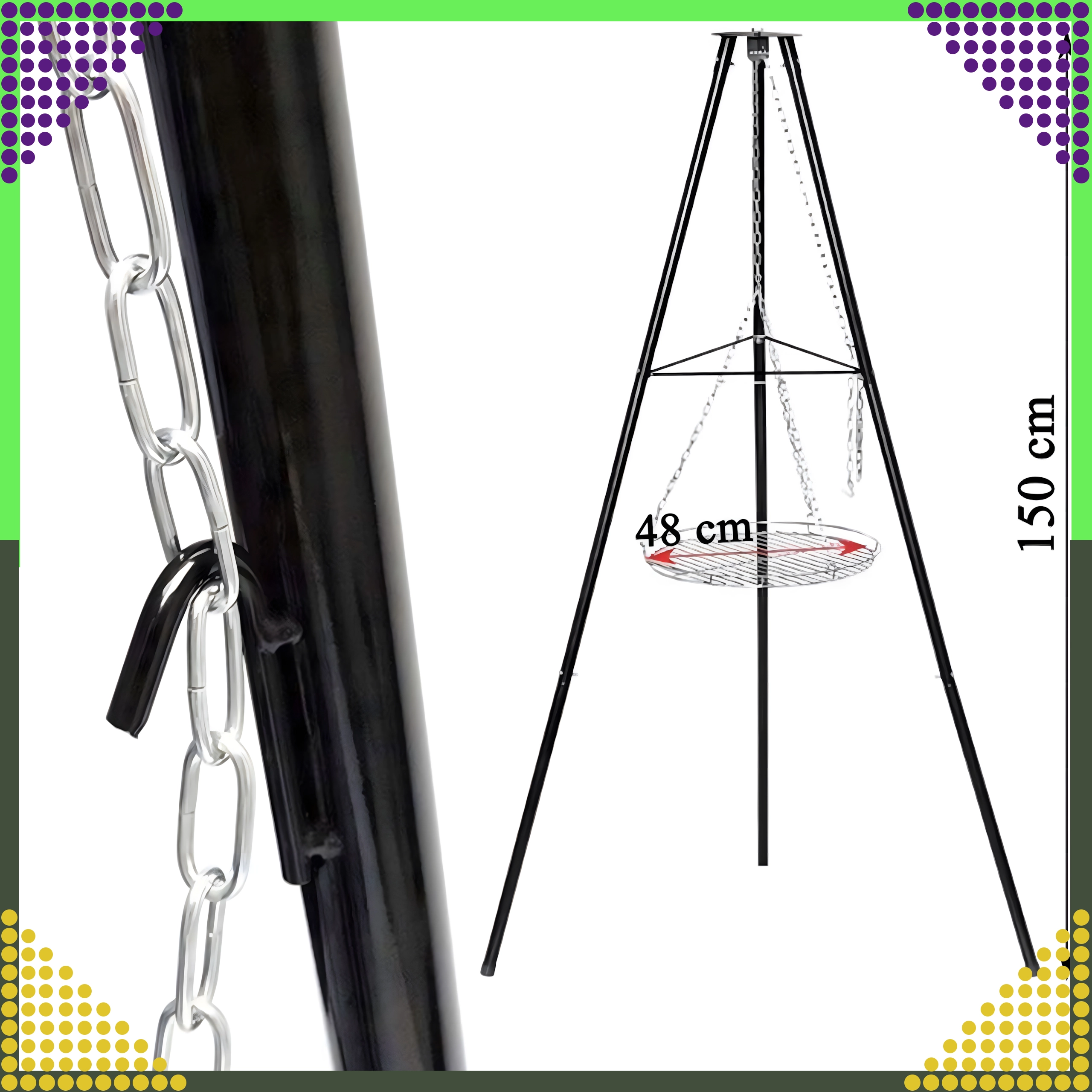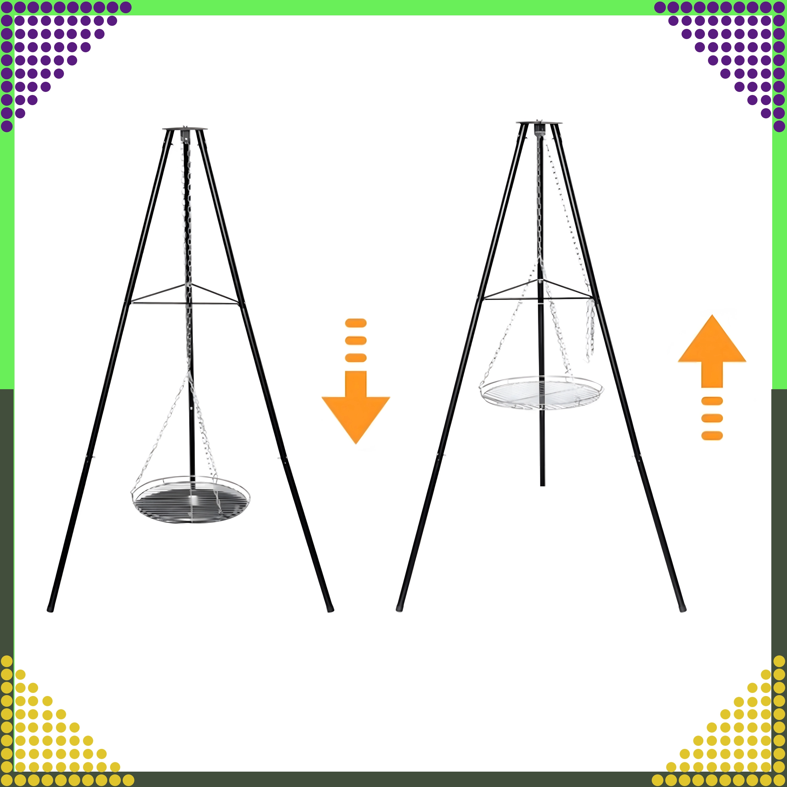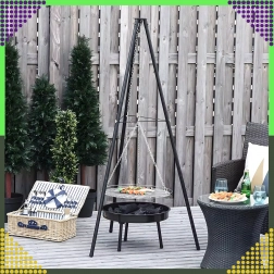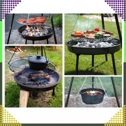 Dieser elegante und robuste Garten-Dreibein-Grill ist die ideale Lösung für alle, die über offenem Feuer grillen möchten, aber keinen festen Platz für eine Feuerstelle haben. Der höhenverstellbare Rost (Ø 50 cm) an Kettenaufhängung ermöglicht eine präzise Temperaturkontrolle und gleichmäßiges Garen von Fleisch und Gemüse. Die stabile Dreibein-Konstruktion aus pulverbeschichtetem Stahl ist hitzebeständig und leicht zu pflegen.