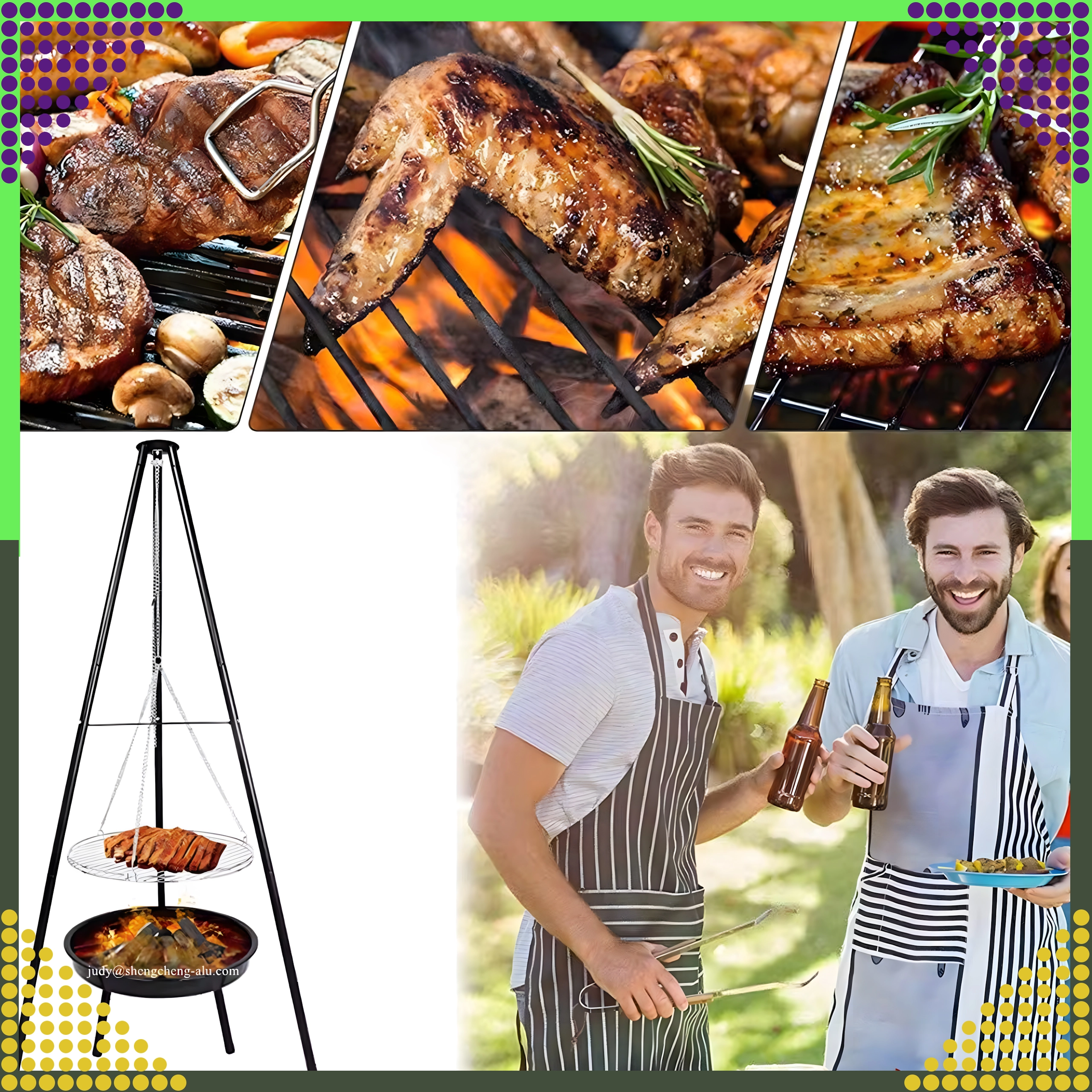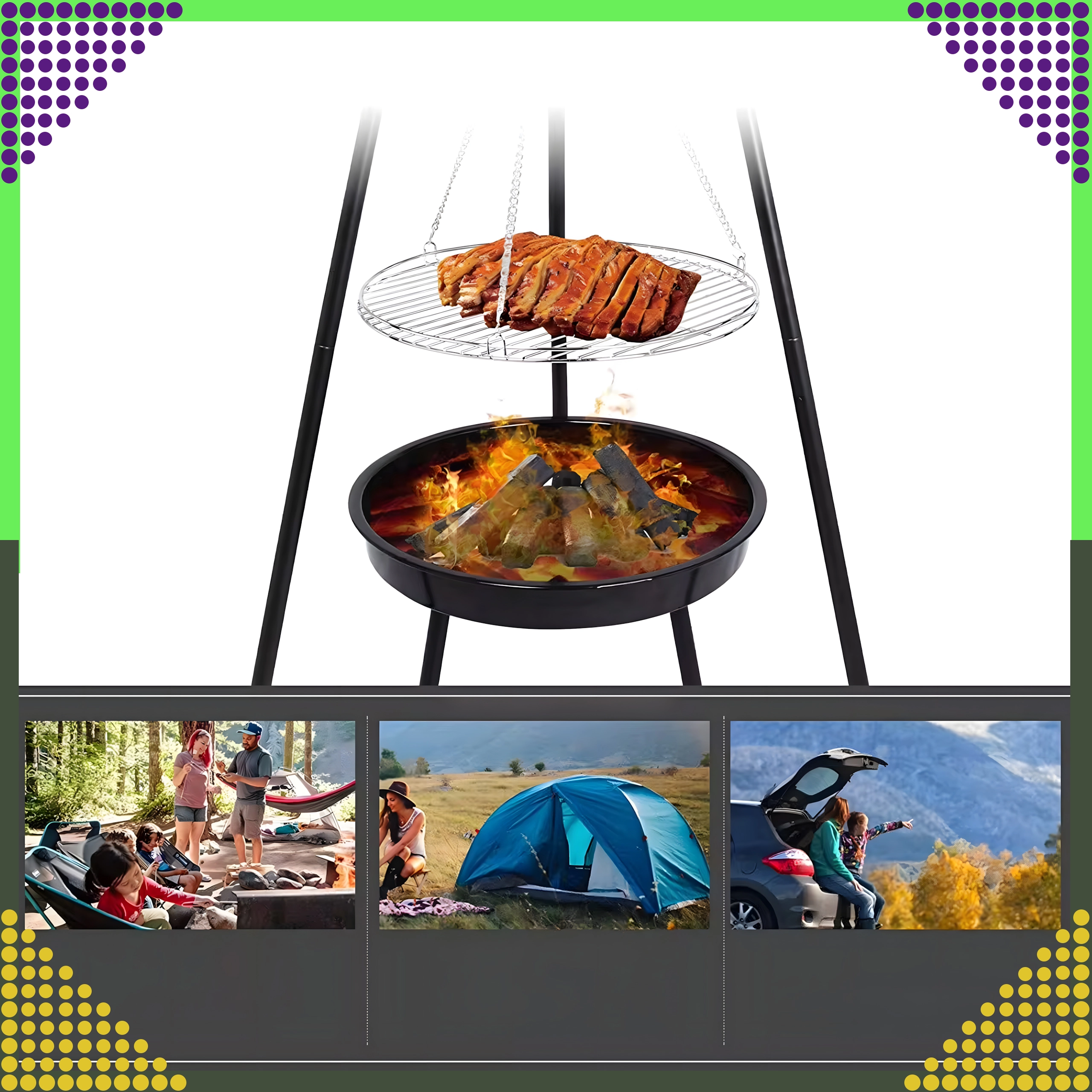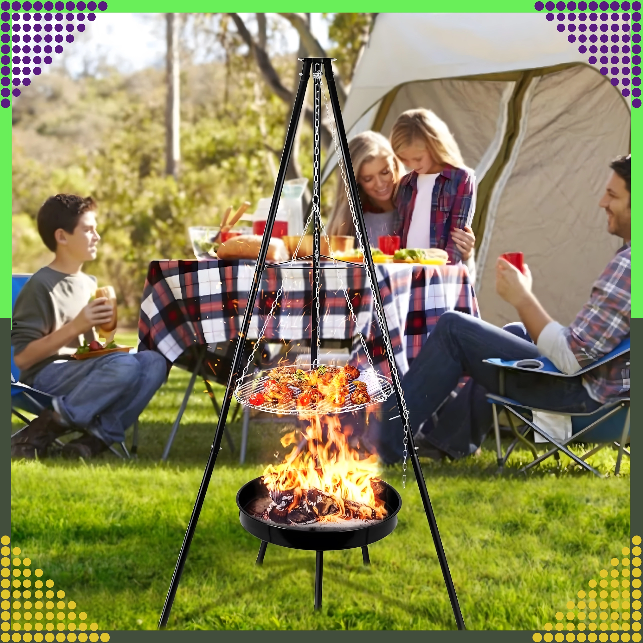 Das dreibeinige Gestell aus pulverbeschichtetem Stahl widersteht hohen Temperaturen und sorgt für sicheres Grillen im Garten wie auch auf dem Campingplatz.
