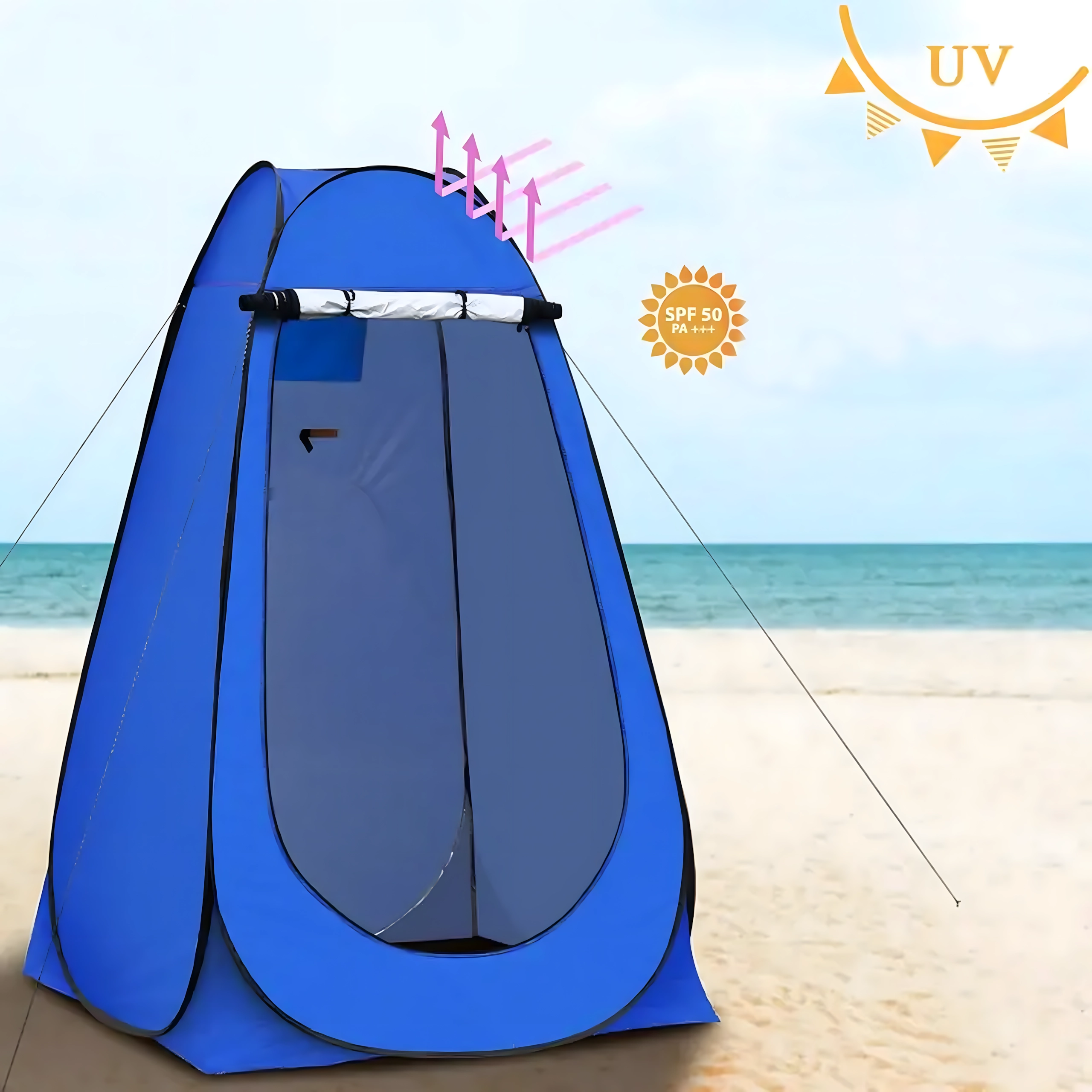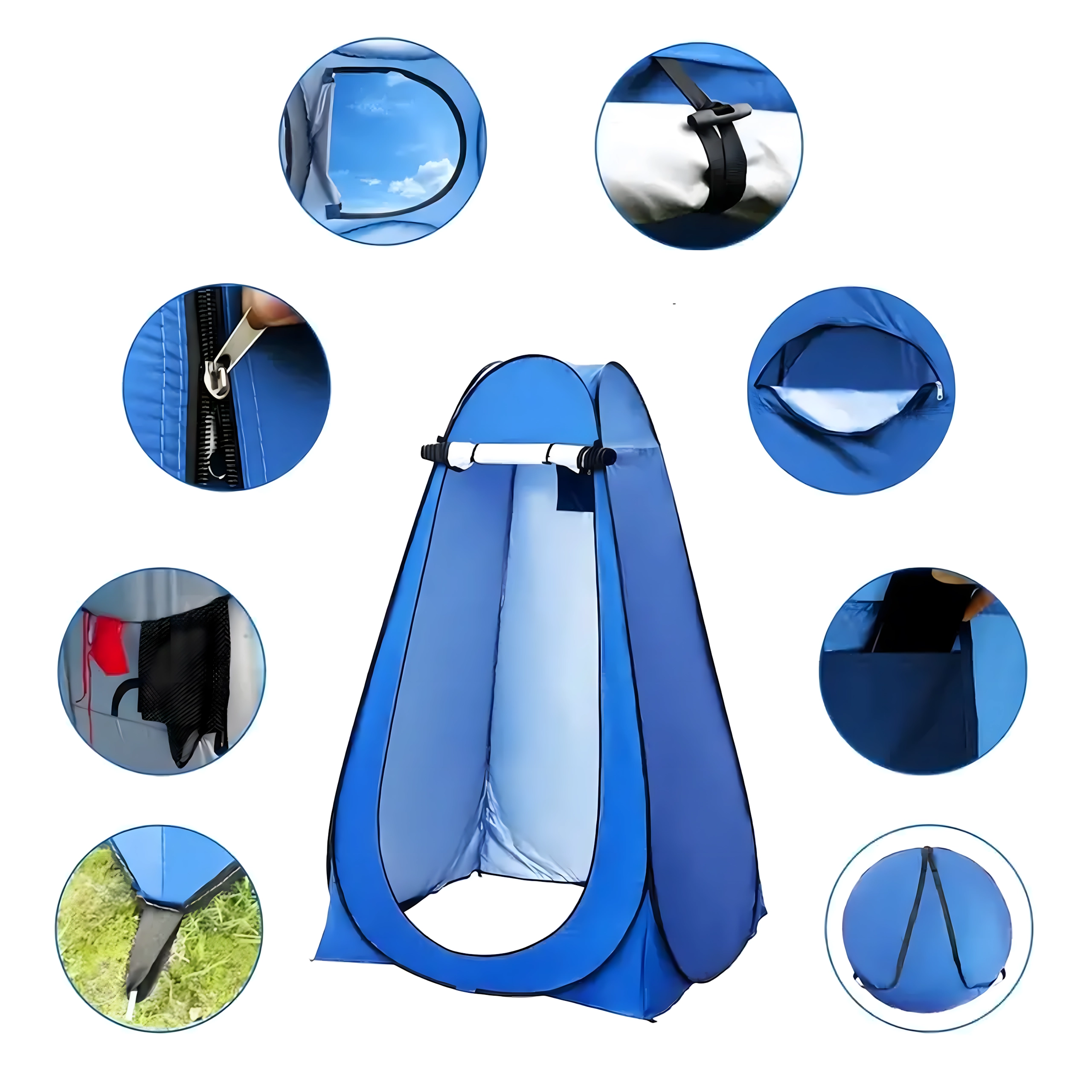 Die hohe Bauweise ermöglicht bequemes Umkleiden oder Duschen, ein Belüftungsfenster sorgt für Luftzirkulation und der große Reißverschluss‑Eingang verbessert den Zugang. Innen finden Sie praktische Elemente zur Organisation.