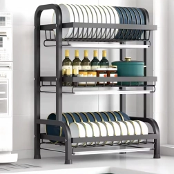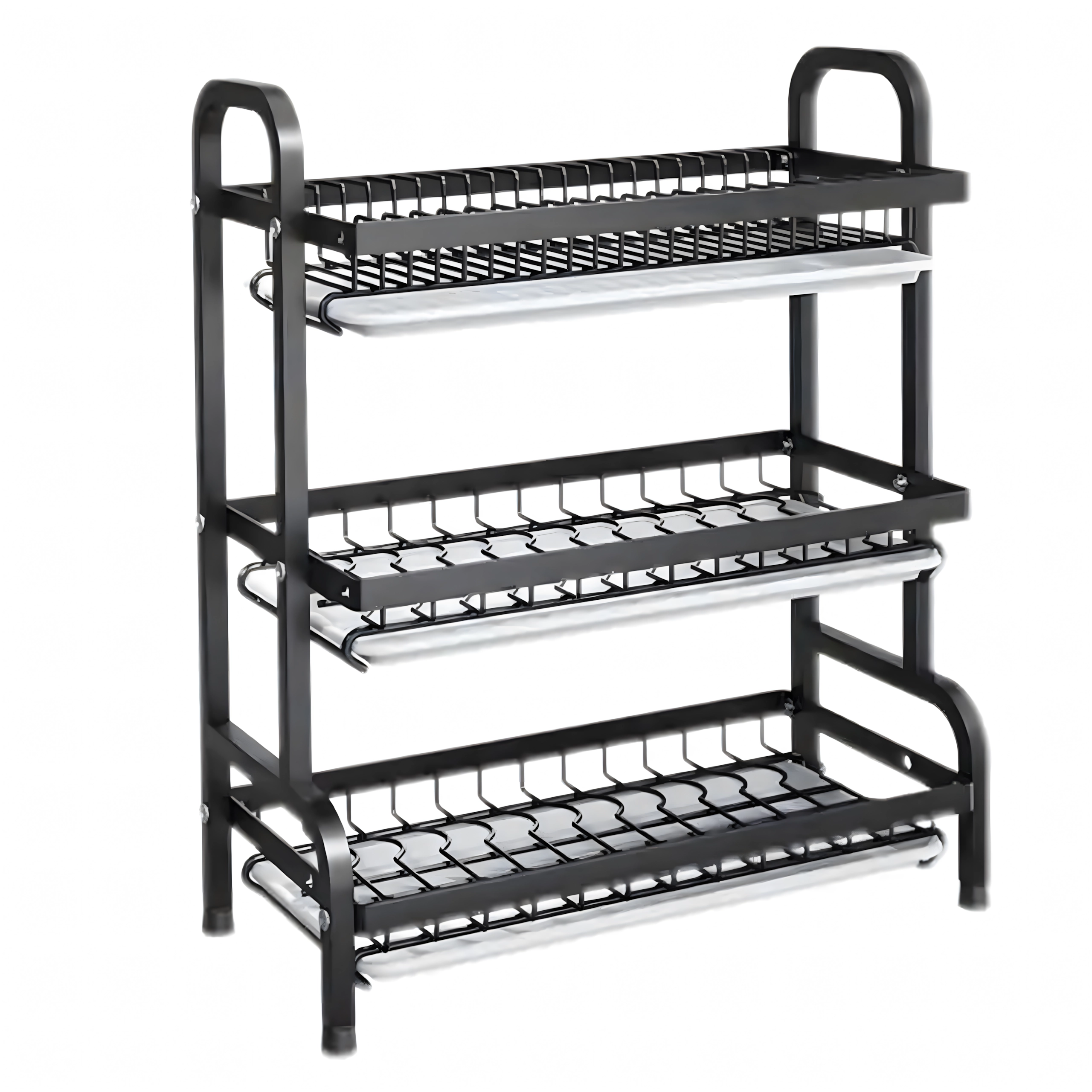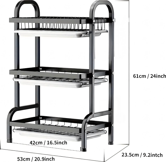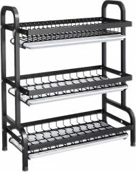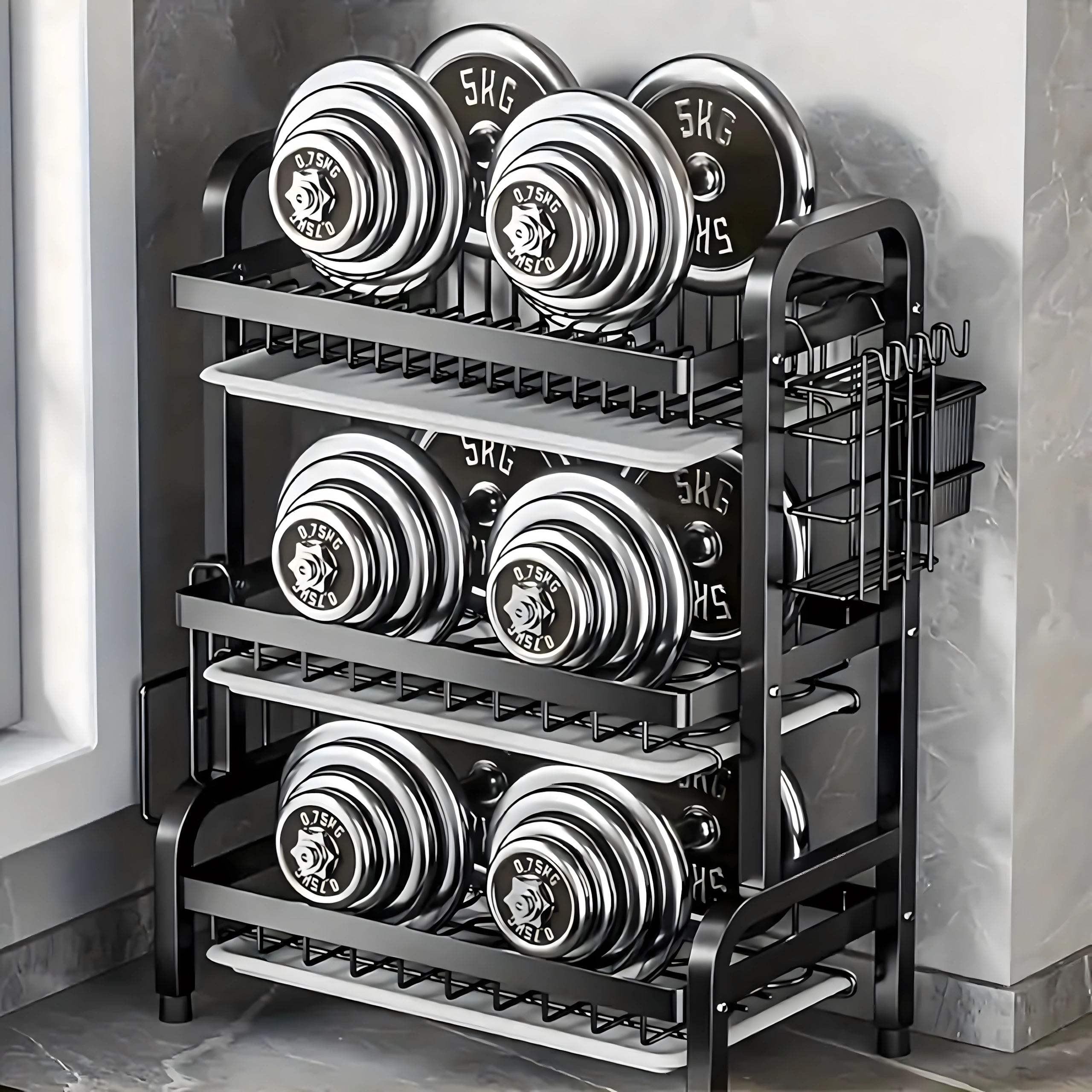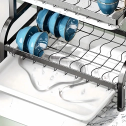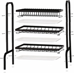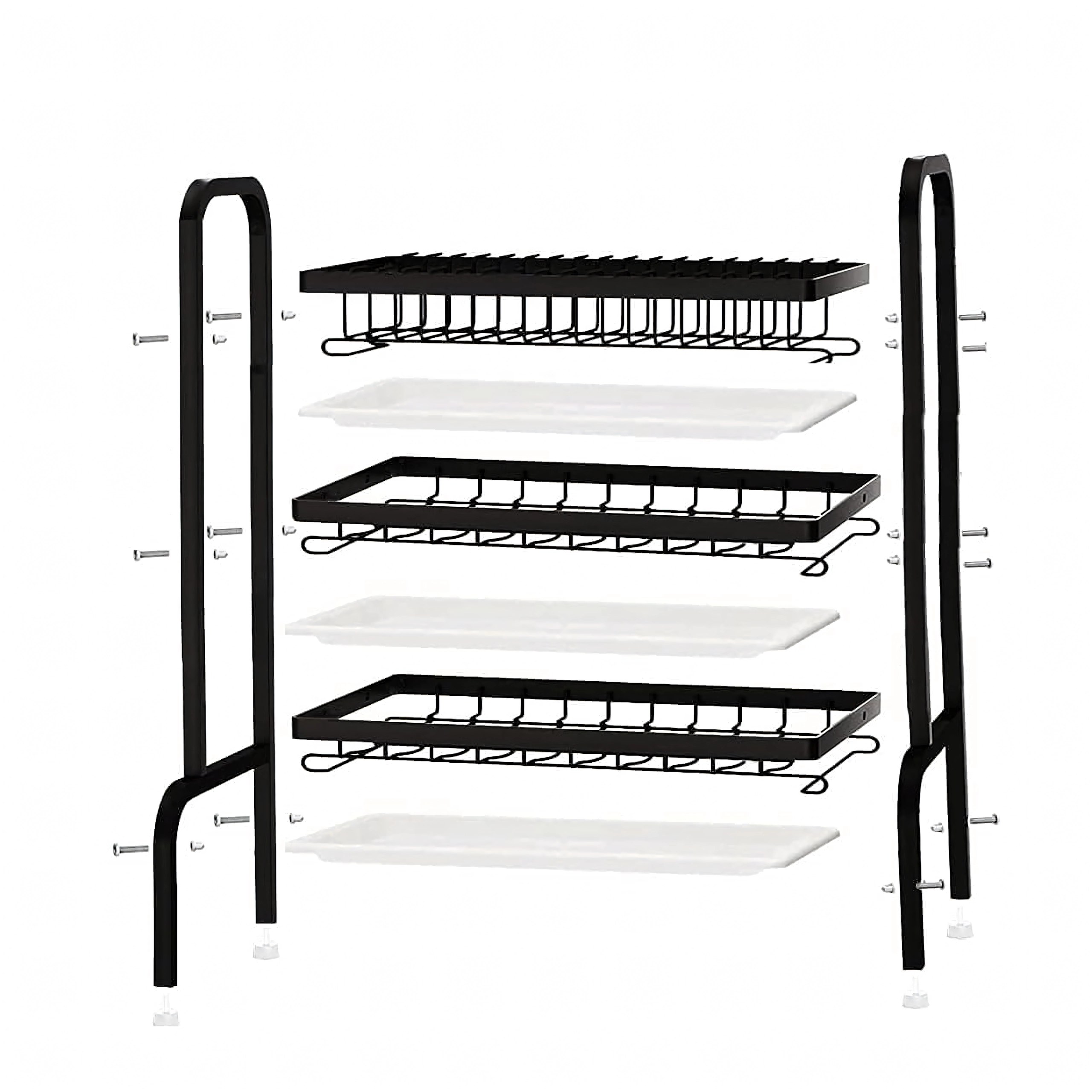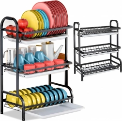 Dieses XXL-Geschirr-Abtropfgestell mit großer Kapazität und drei Ebenen kombiniert eine robuste Metallkonstruktion mit einem klaren, modernen Look. Dank rostbeständigem Edelstahl und leicht herausnehmbaren Abtropfschalen bleibt die Küchenarbeitsplatte trocken und aufgeräumt.