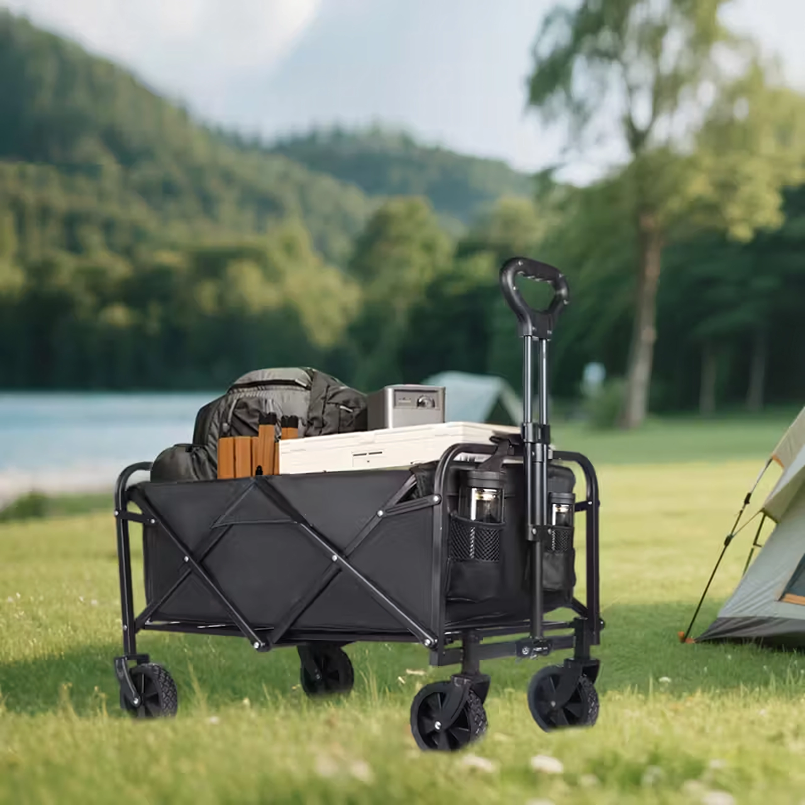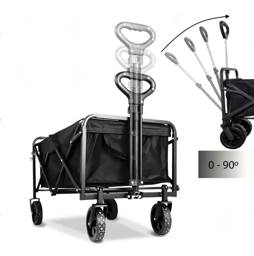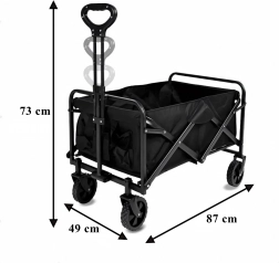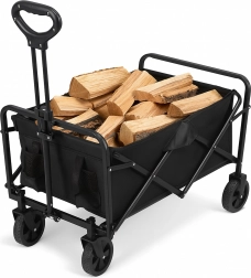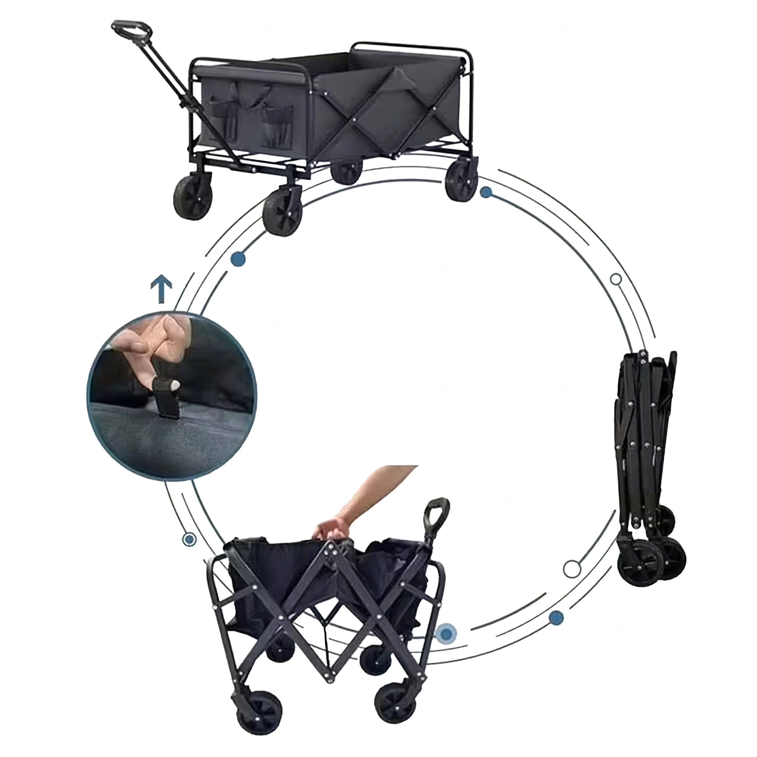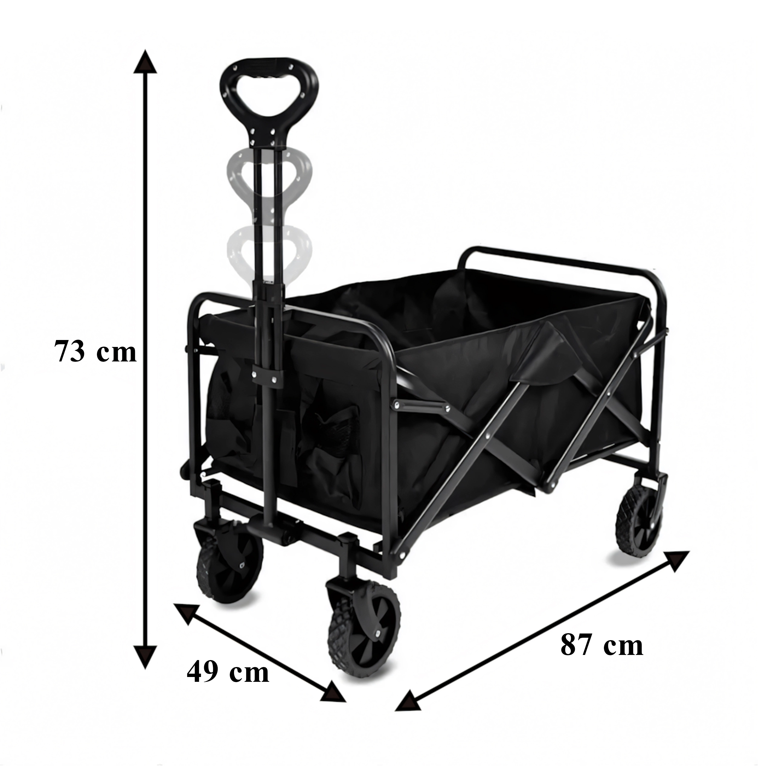 Praktischer, klappbarer Wagen mit robuster Stahlkonstruktion, wasserabweisendem Material und um 360° drehbaren Rädern – ideal für Strand, Garten, Camping und Einkäufe. Lässt sich leicht zusammenklappen, benötigt nur wenig Platz und transportiert zuverlässig Ihre Gegenstände sowie Brennholz.