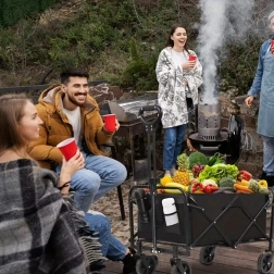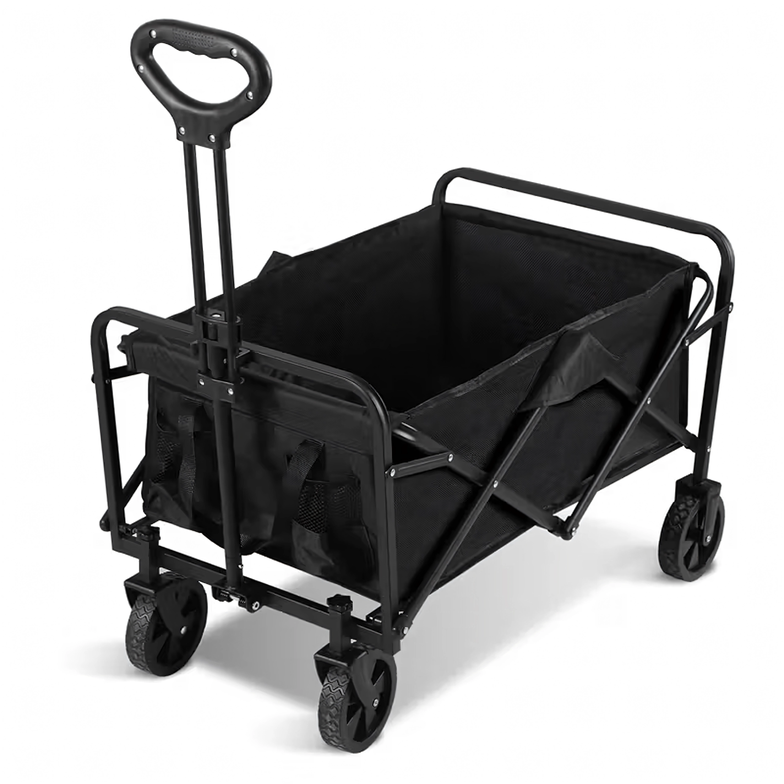 Nach dem Einsatz klappen Sie den Wagen in wenigen Sekunden kompakt zusammen und verstauen ihn im Kofferraum oder Schrank. Praktische Seitentaschen halten Kleinigkeiten griffbereit, der Teleskopgriff erleichtert das Ziehen und die stabile Konstruktion behält ihre Form auch bei voller Beladung.
