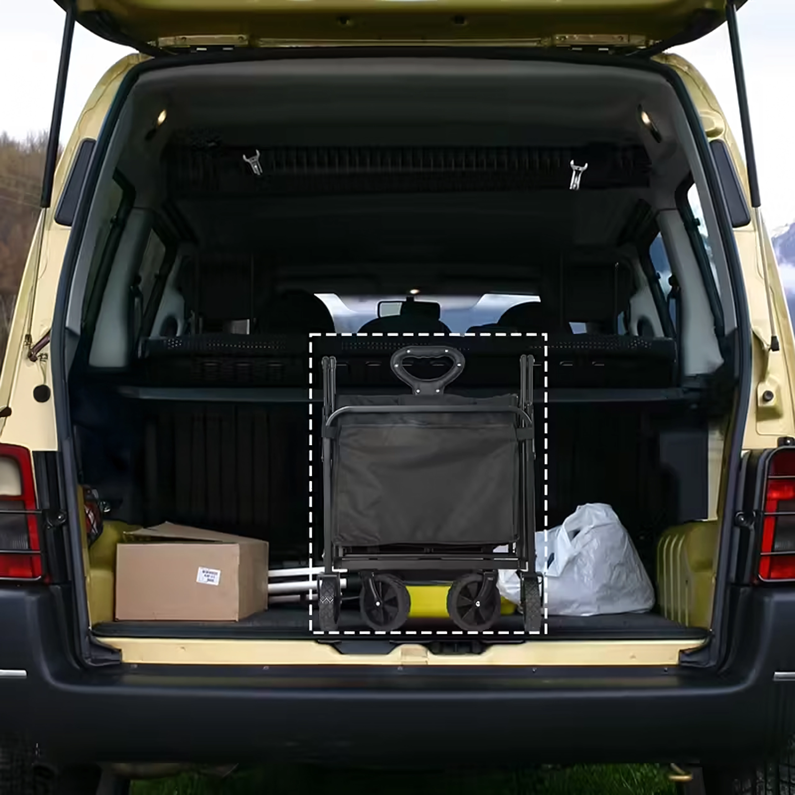 Der klappbare Stahlrahmen und der widerstandsfähige Stoff ermöglichen den sicheren Transport schwererer Lasten – von Holz bis hin zu Campingausrüstung.