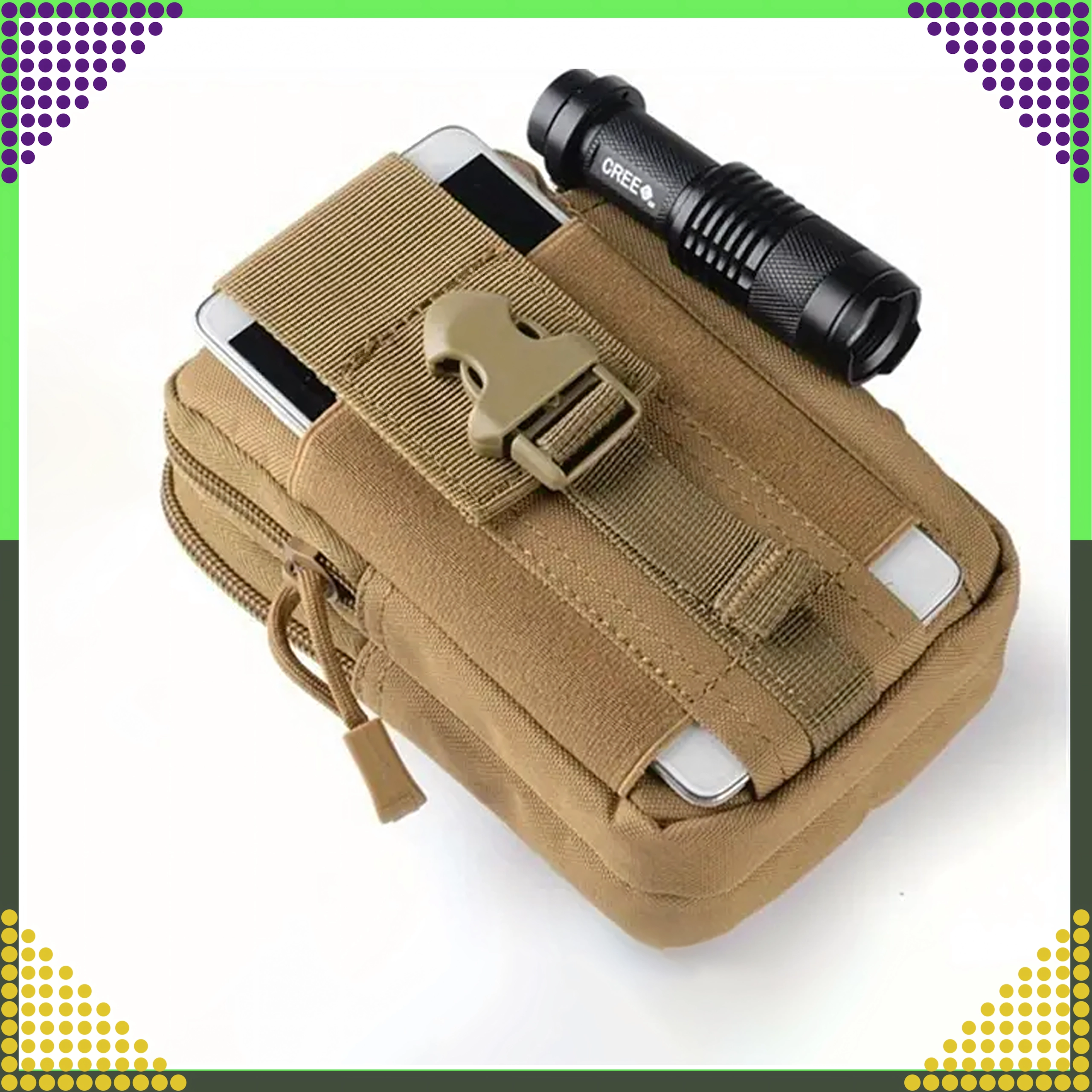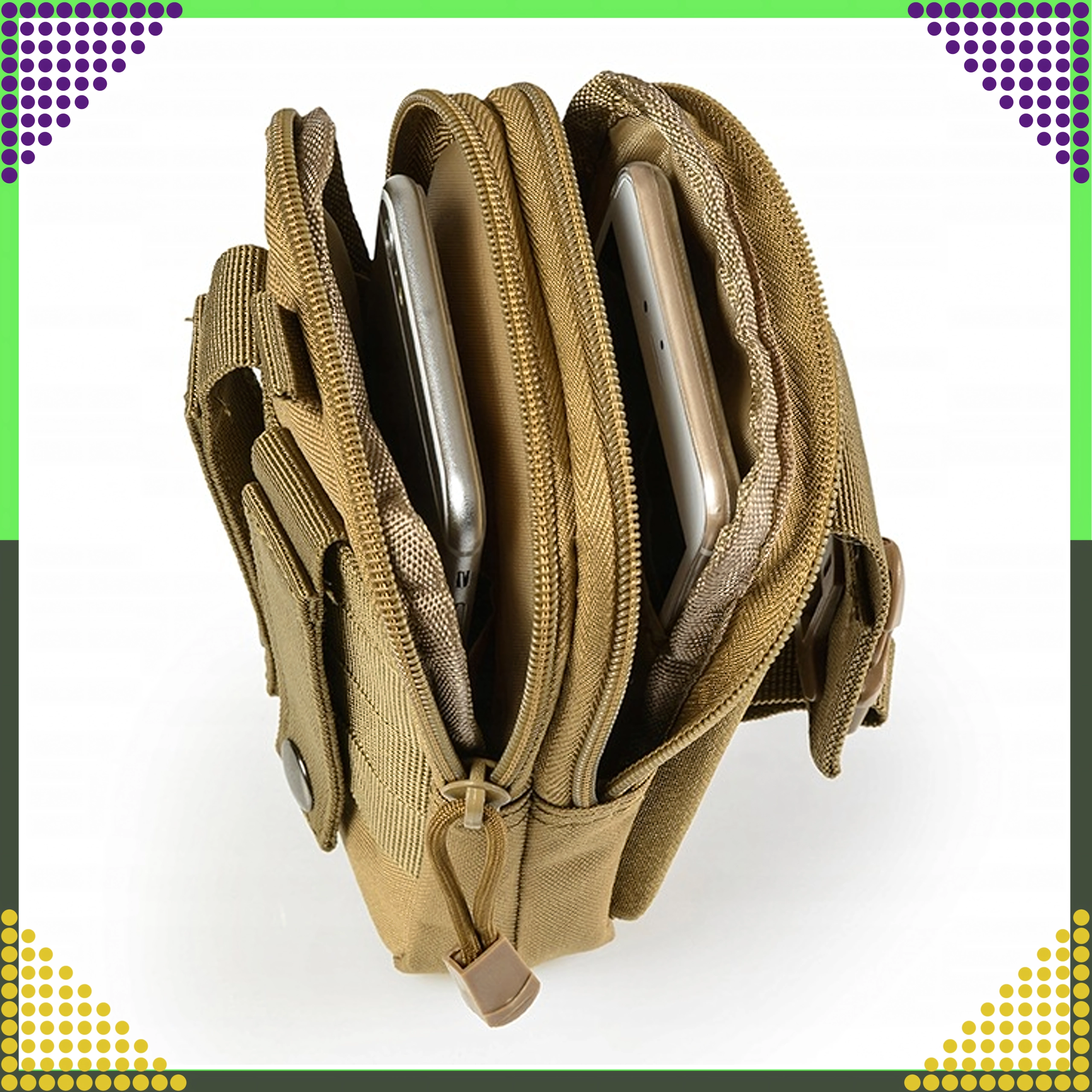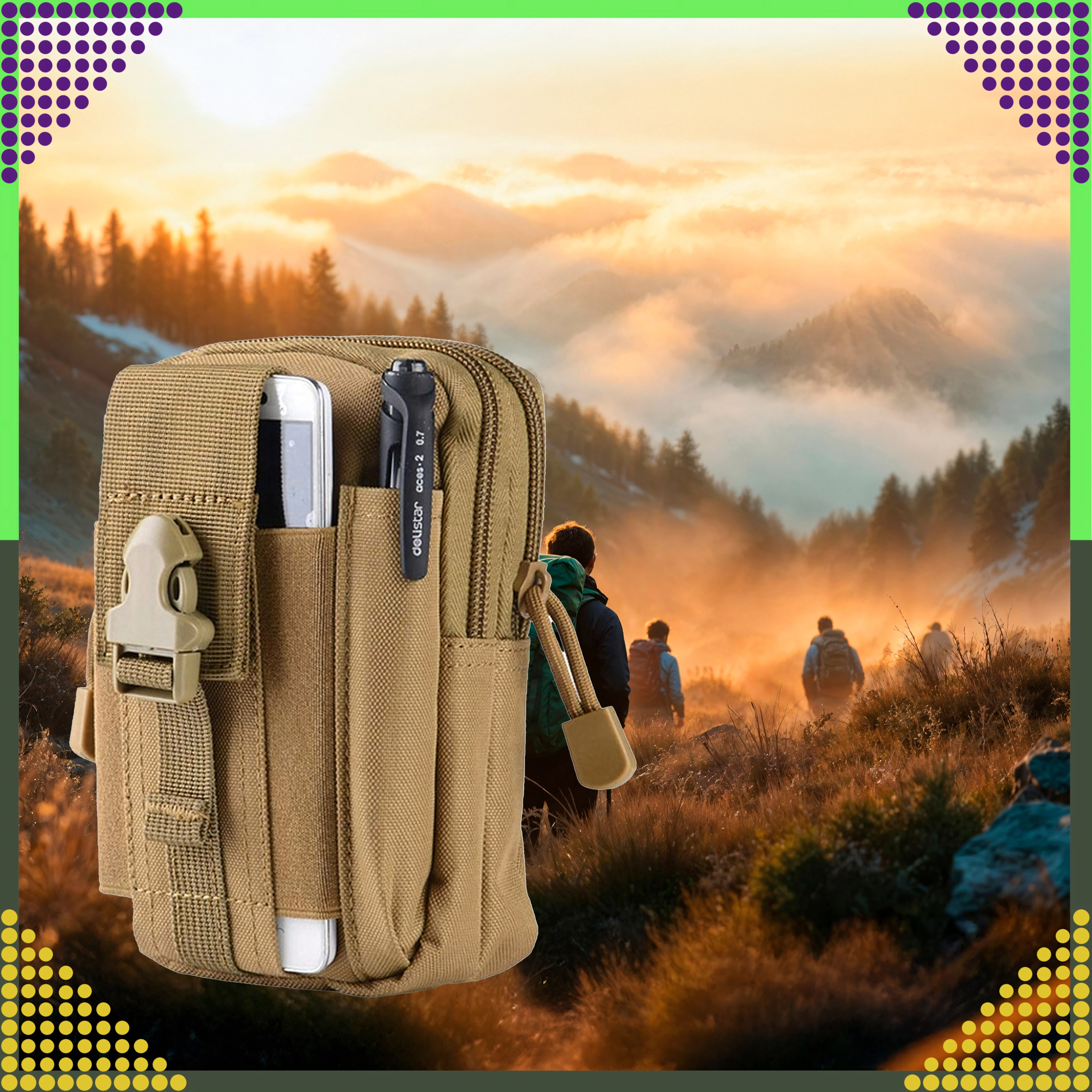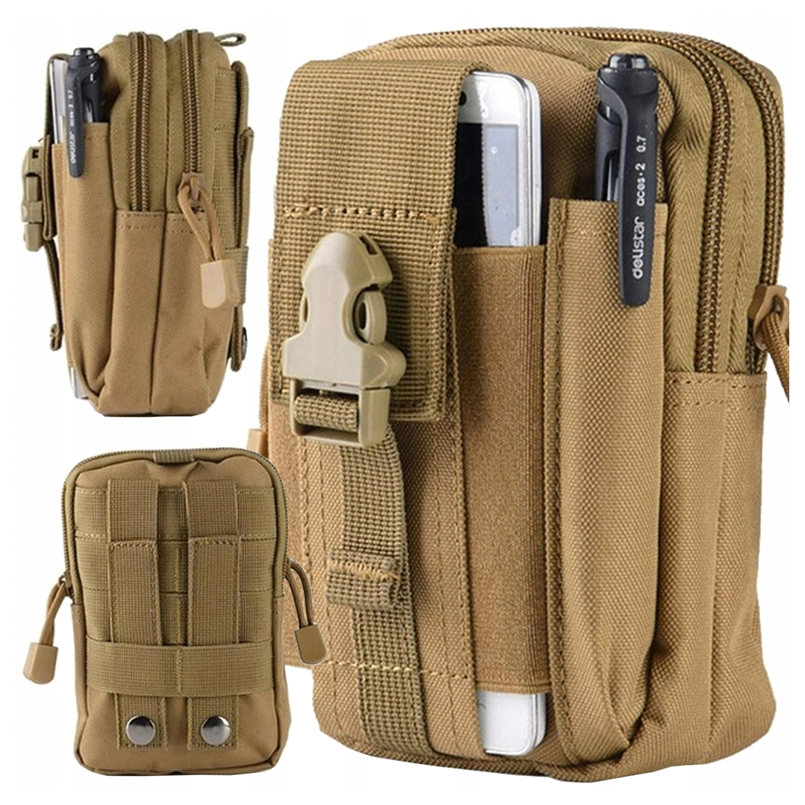 Dieser vielseitige Outdoor-Organizer in Braun hält Ihre Essentials übersichtlich und sicher griffbereit. Dank MOLLE-System lässt er sich einfach am Gürtel, Rucksack oder an taktischer Ausrüstung befestigen. Zwei geräumige Hauptfächer mit Reißverschluss, eine Fronttasche fürs Telefon und seitliche Schlaufen für Stift/Taschenlampe sorgen für schnellen Zugriff und hervorragende Organisation.