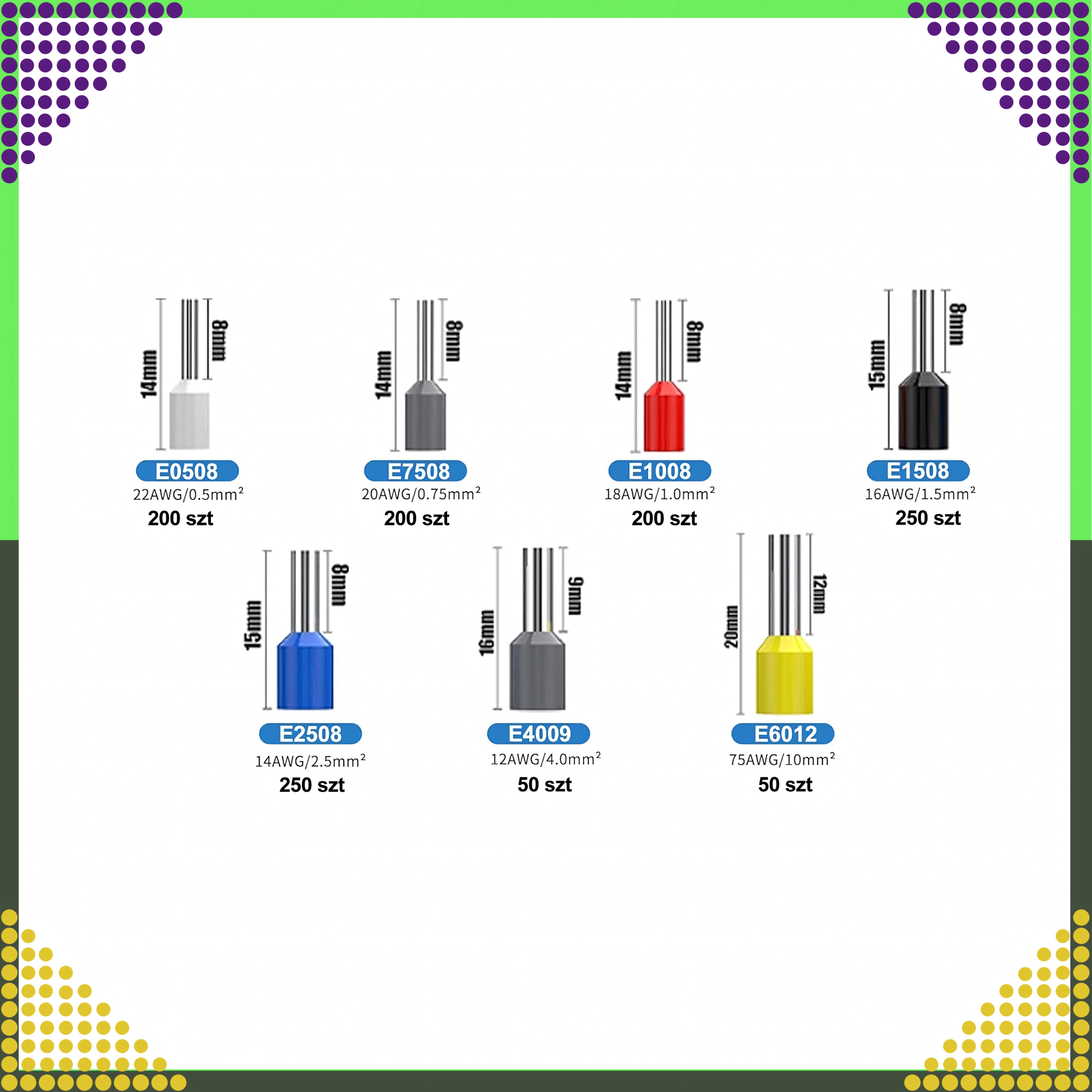 Dieses praktische Set isolierter Aderendhülsen ist für das sichere und saubere Abschließen von mehrdrähtigen (Litzen-)Leitern konzipiert. Die Hülsen bündeln und fixieren die einzelnen Litzen, erhöhen die Ordnung im Schaltschrank, verhindern das Herausreißen des Leiters und minimieren das Kurzschlussrisiko. Dank der Farbcodierung wählen Sie schnell die passende Größe für den jeweiligen Querschnitt.