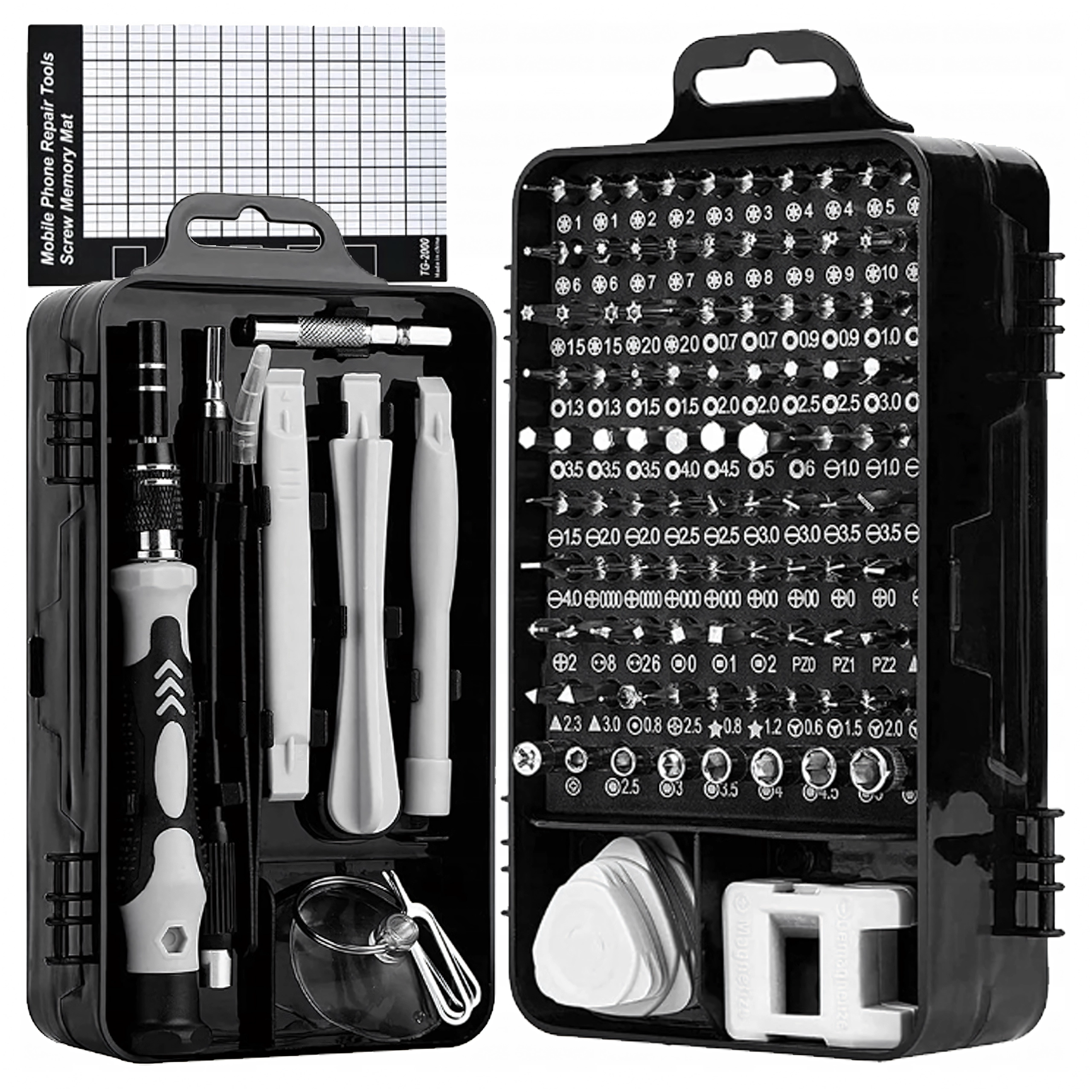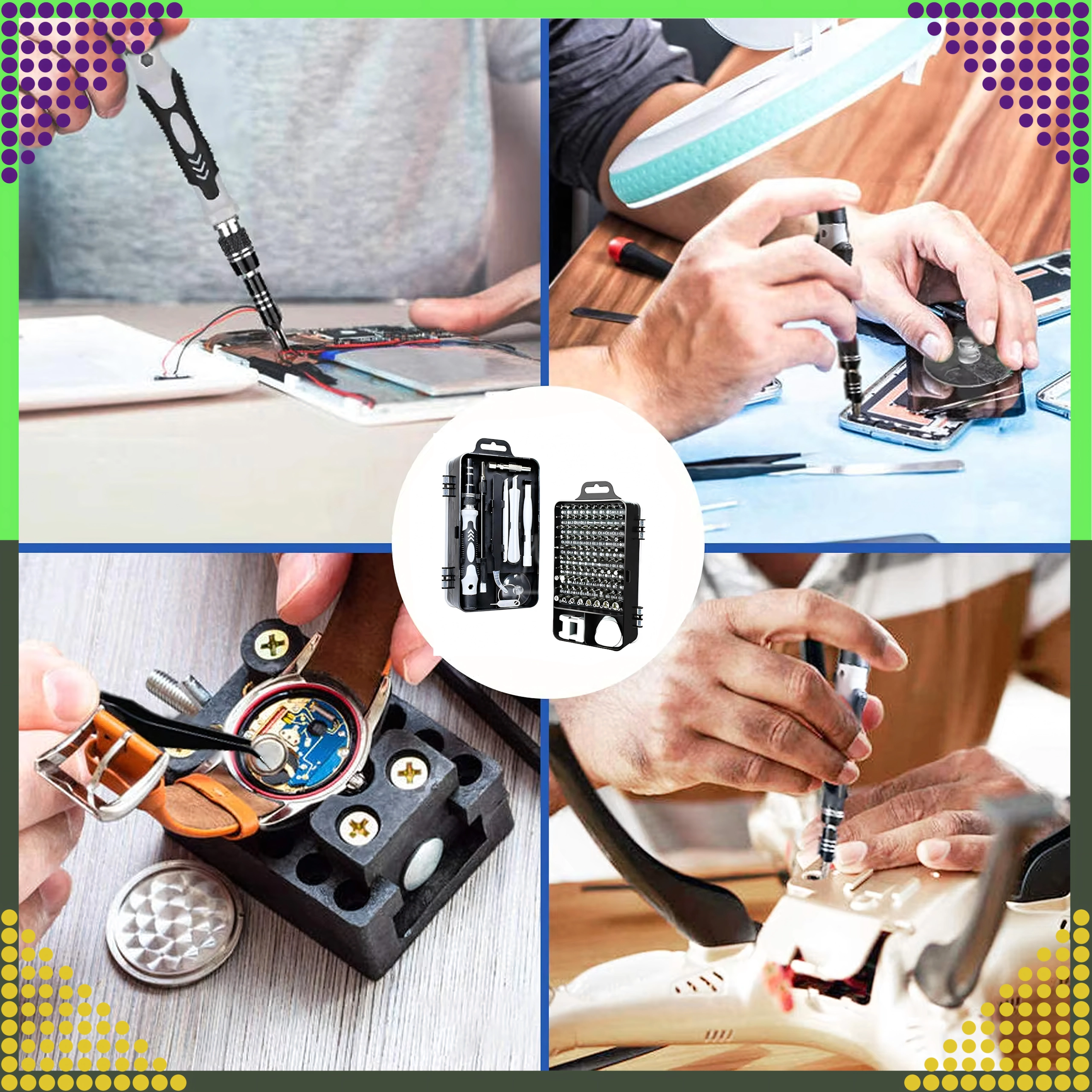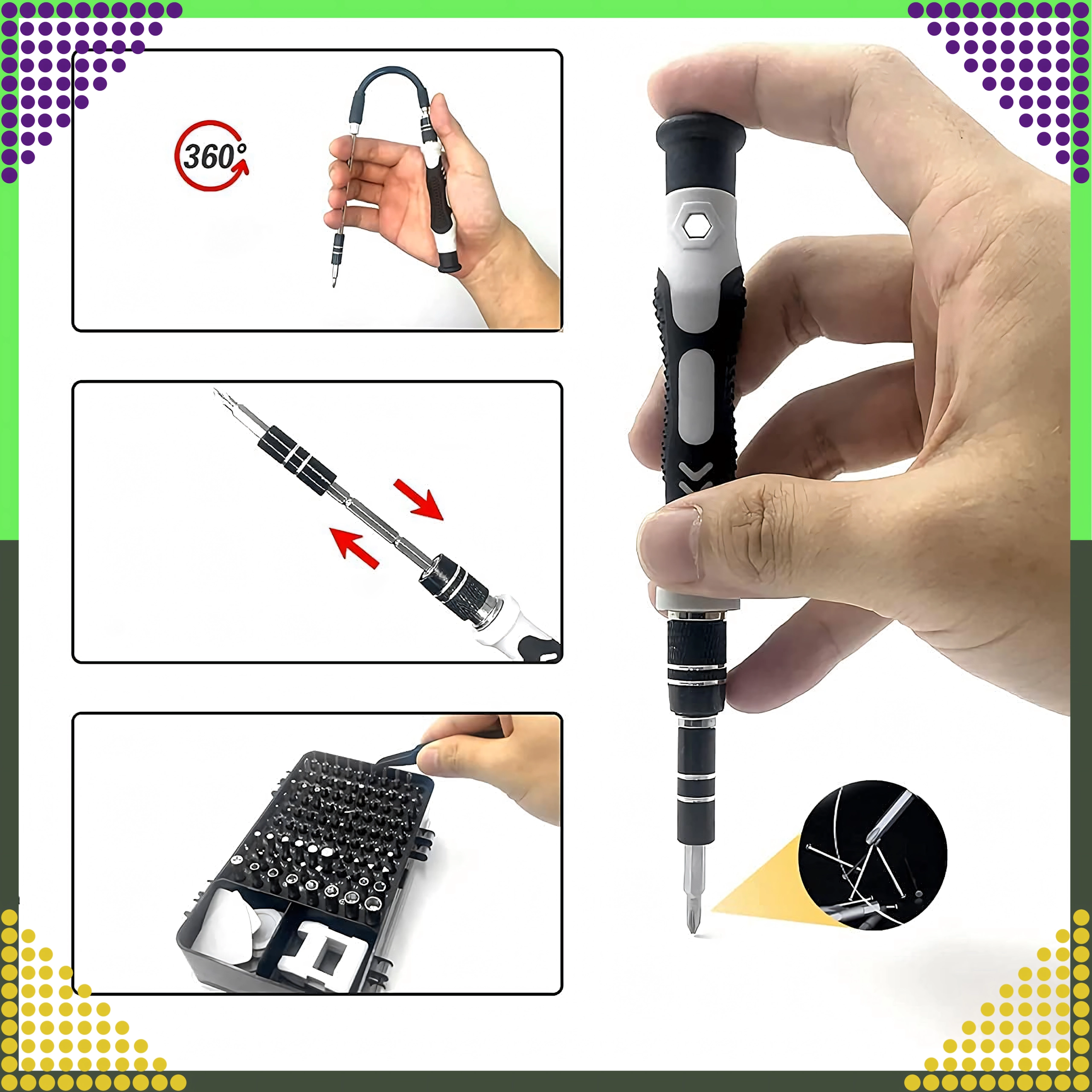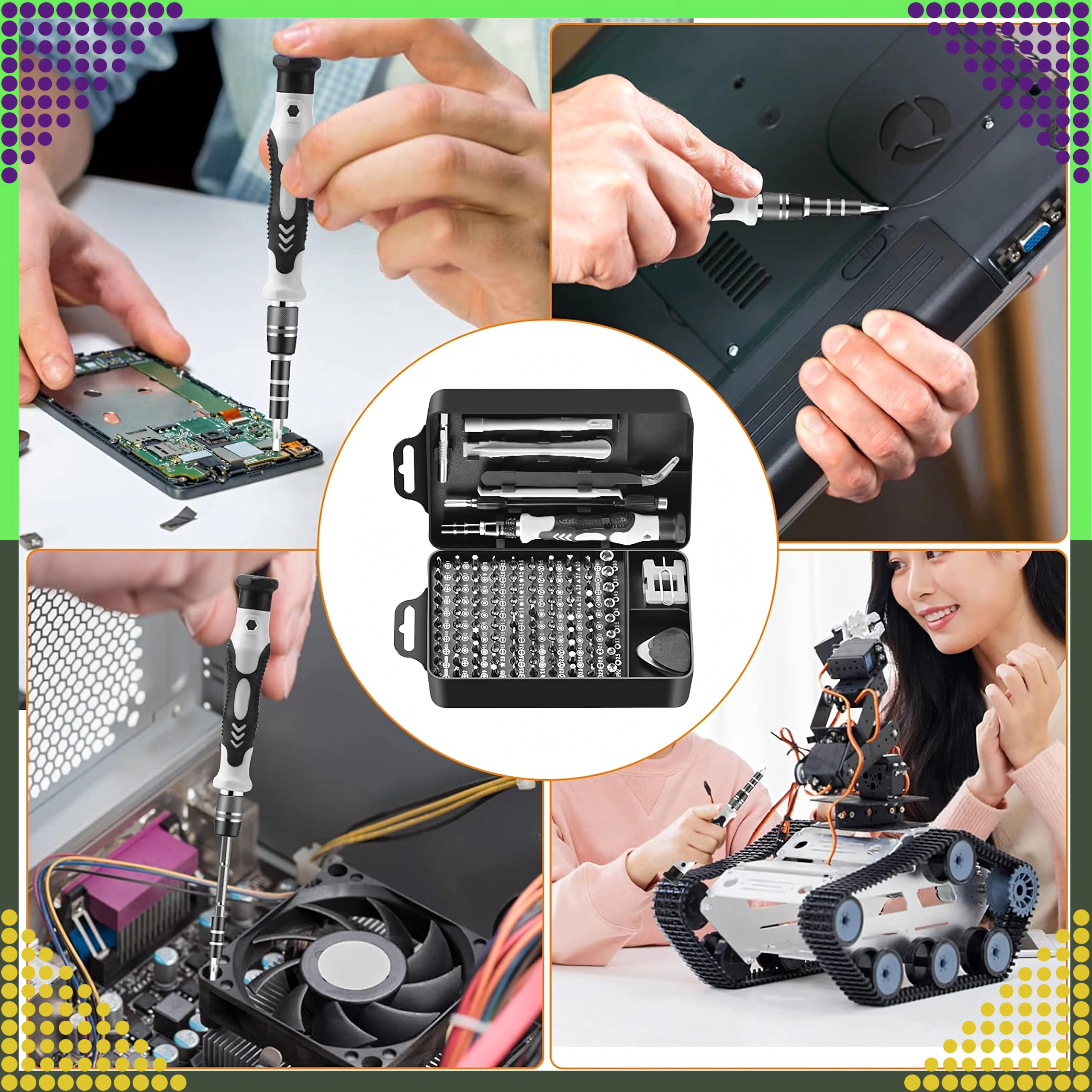 Das Set enthält 100 magnetische Bits mit schlanken Schäften für schwer zugängliche Stellen, drei Verlängerungen für flexibles Arbeiten sowie Zubehör zum Zerlegen von Smartphones, Laptops oder Kameras. Dank ergonomischem, rutschfestem Griff und langlebigem Stahl ist die Arbeit präzise, komfortabel und sicher.