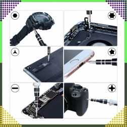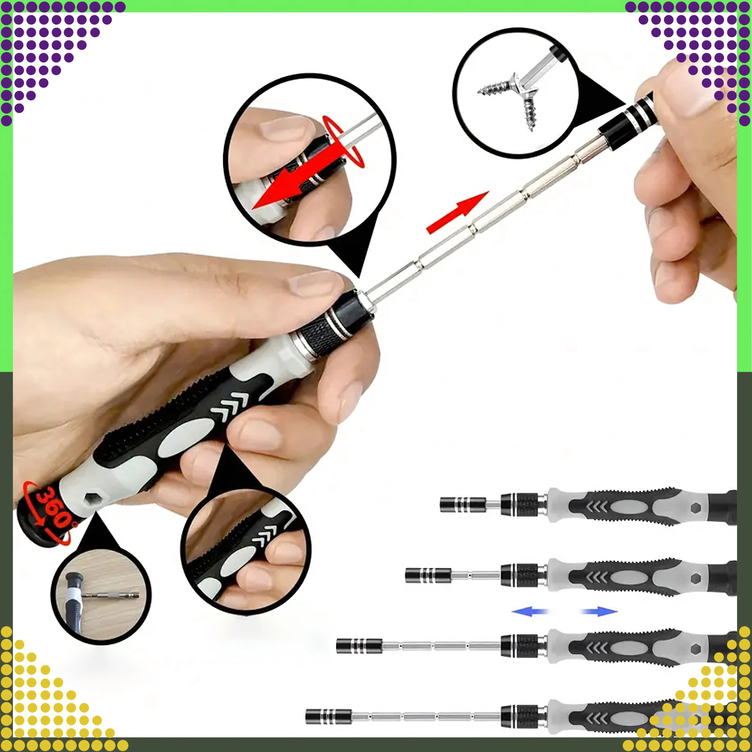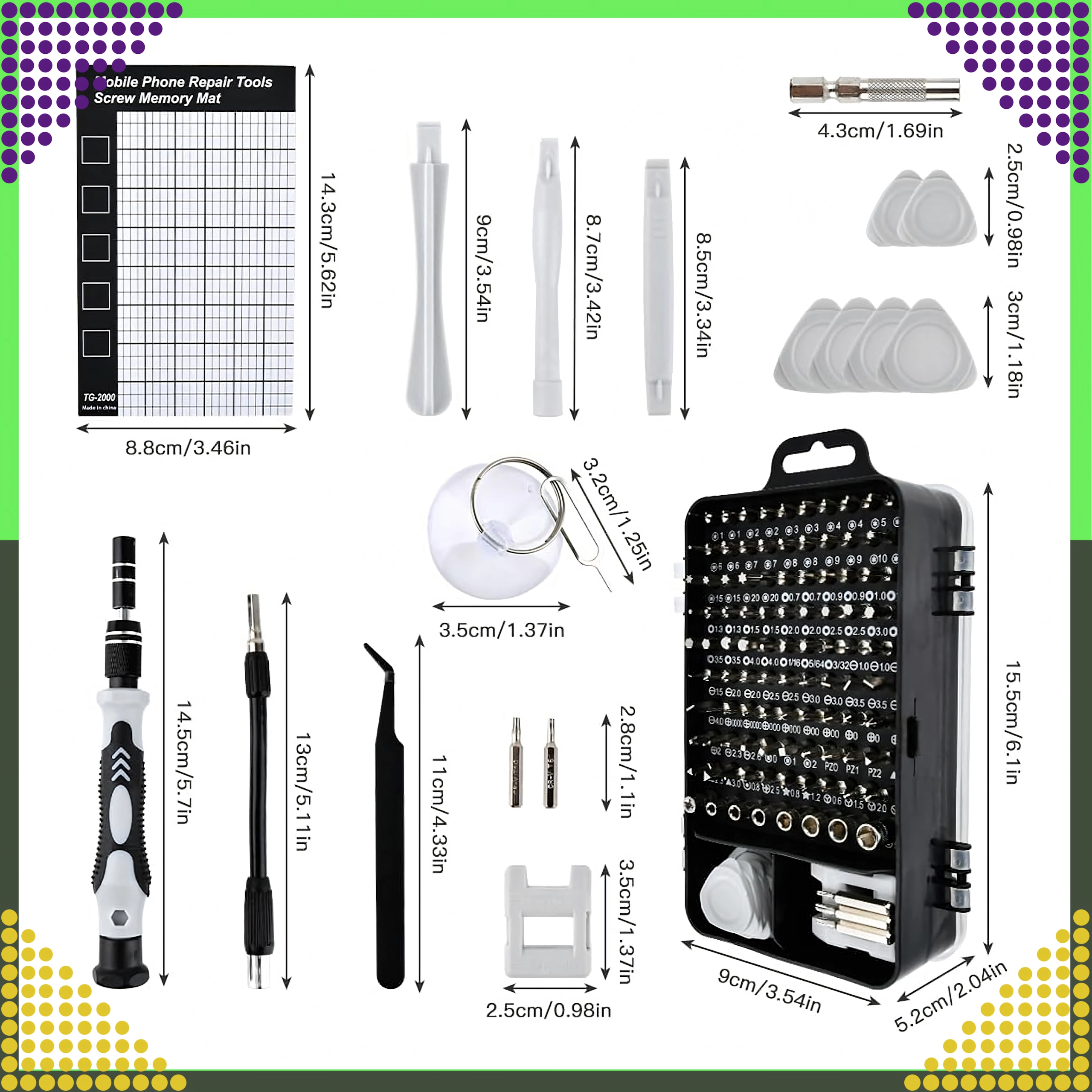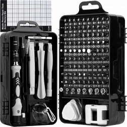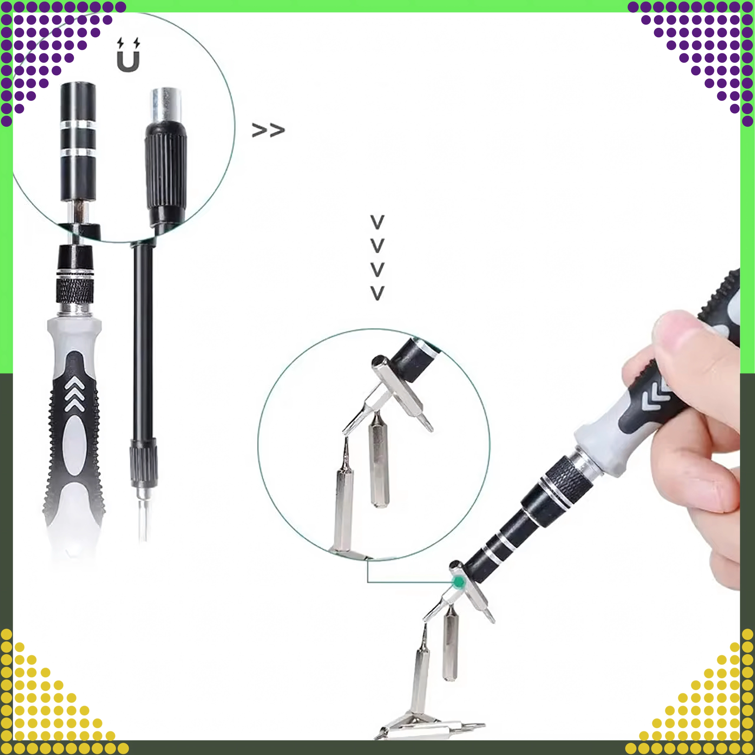 Das Set enthält 100 magnetische Bits mit schlanken Schäften für schwer zugängliche Stellen, drei Verlängerungen für flexibles Arbeiten sowie Zubehör zum Zerlegen von Smartphones, Laptops oder Kameras. Dank ergonomischem, rutschfestem Griff und langlebigem Stahl ist die Arbeit präzise, komfortabel und sicher.