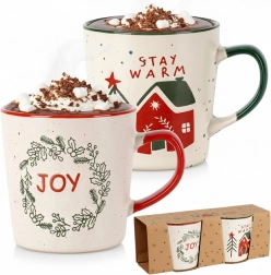 Die Becher sind mit zarten festlichen Motiven und den Aufschriften JOY und STAY WARM verziert, ergänzt durch kontrastierende Farbakzente in Rot und Grün. Das gesamte Set befindet sich in einer ästhetischen Geschenkverpackung – ein toller Geschenktipp für Familie oder Freunde. Die praktische Nutzung wird durch die Möglichkeit der Reinigung in der Spülmaschine und des Erwärmens in der Mikrowelle abgerundet.