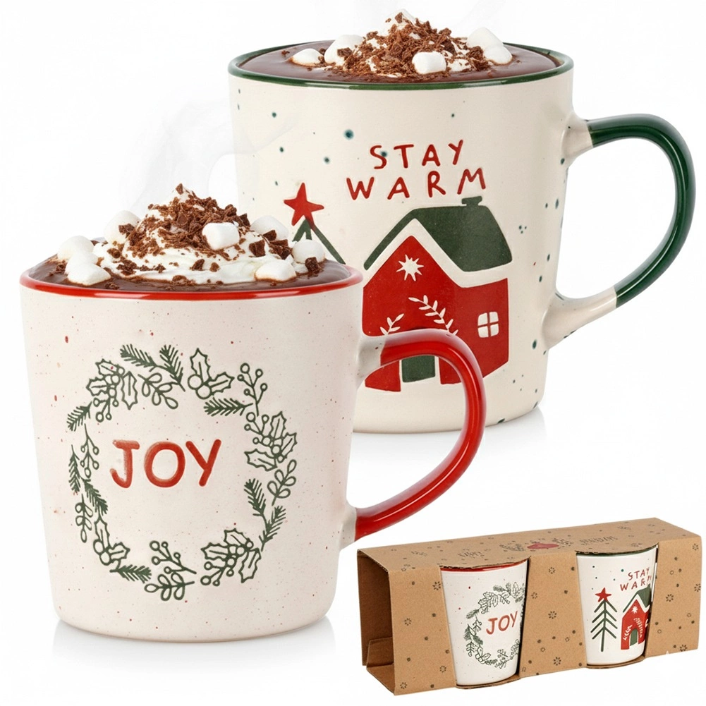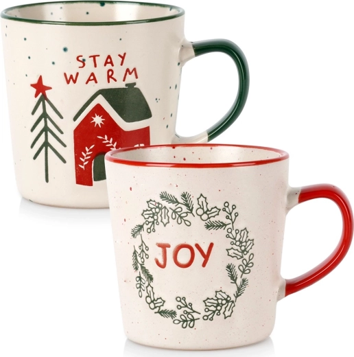 Bringen Sie festliche Stimmung in Ihr Zuhause mit einem Set aus zwei Keramikbechern mit 350 ml Fassungsvermögen. Stilvolle beige Becher mit den Motiven JOY und STAY WARM besitzen farbige Ränder und Henkel in Rot und Grün, halten die Wärme hervorragend und sind spülmaschinen- und mikrowellengeeignet. Geliefert in Geschenkverpackung – ideal als Weihnachtsgeschenk.