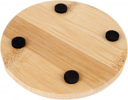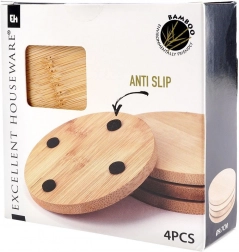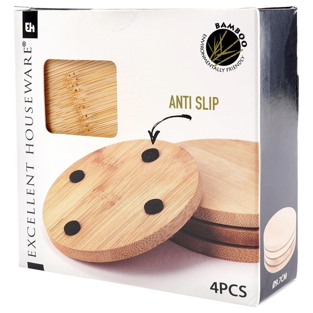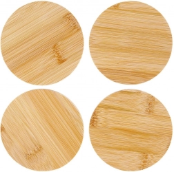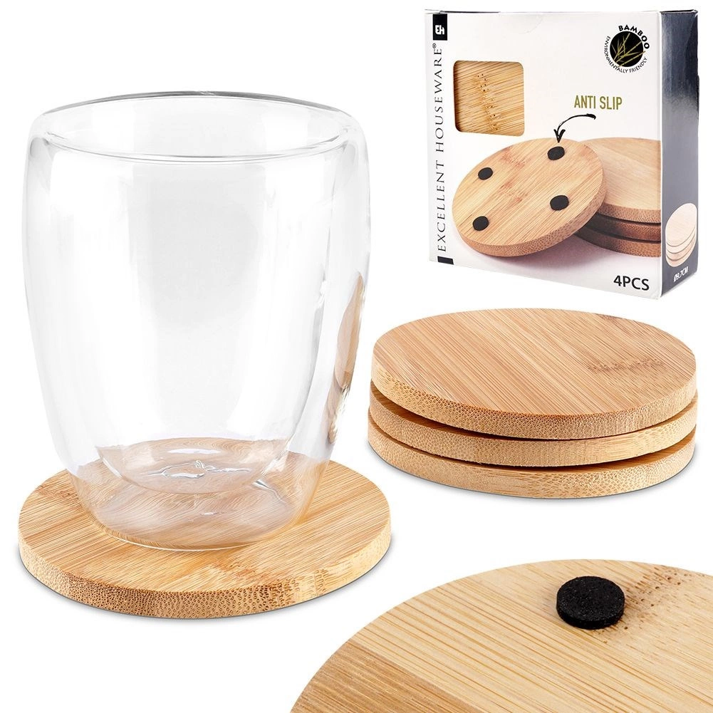 Elegantes Set aus vier runden Untersetzern aus natürlichem Bambus schützt den Tisch vor Hitze, Kälte und Feuchtigkeit. Sie haben einen Durchmesser von 9,7 cm, eine glatte Oberfläche und auf der Unterseite rutschfeste Filzpads für Stabilität. Robuster Bambus ist umweltfreundlich, feuchtigkeitsbeständig und nicht saugfähig – ideal für heiße und kalte Getränke, damit Ihr Tisch frei von Rändern und Kratzern bleibt.