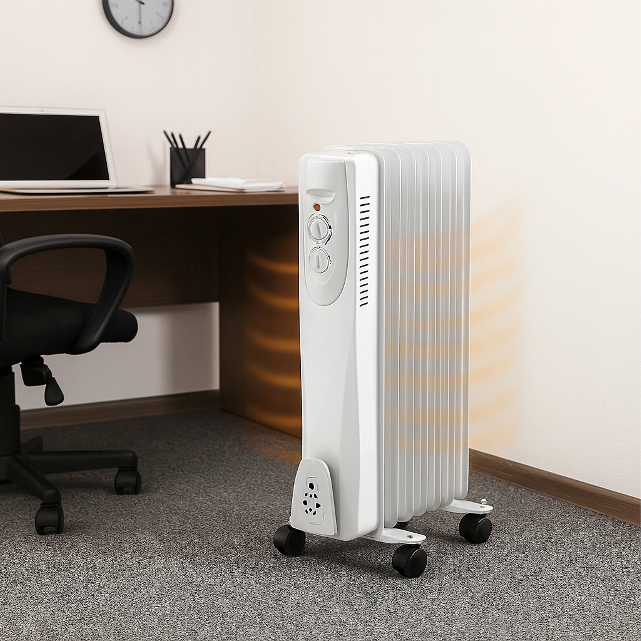 Kompakter Ölradiator mit einer Leistung von 1500 W sorgt für schnelle und sparsame Beheizung kleiner bis mittelgroßer Räume. Dank präzisem Thermostat und 3 Leistungsstufen stellen Sie mühelos die ideale Temperatur ein. Das elegante weiße Design passt in Haus, Büro und Werkstatt, während 360°-Rollen und eine Kabelaufwicklung das Umstellen und Verstauen erleichtern.
