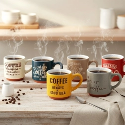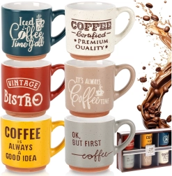 Sechs unterschiedlich farbige Keramiktassen mit Kaffeeaufschriften für stilvolles Servieren von Espresso zu Hause und im Büro.