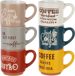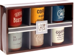 Entdecken Sie die Freude an jedem Schluck mit dem Design-Set aus 6 keramischen Espressotassen. Die farbigen Ausführungen mit originellen Kaffeeaufschriften verleihen Ihrem Tischgedeck Pfiff, während das kompakte Volumen von 110 ml perfekt für echten italienischen Espresso ist.