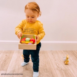 Nach dem Spielen kann das Obst einfach wieder in die Kiste gelegt werden, die mit einem Schiebedeckel ausgestattet ist. Dieses Holzspielzeug besteht aus hochwertigen und verantwortungsvoll beschafften Materialien, die den aktuellen europäischen Sicherheitsnormen entsprechen.