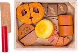 Jedes Gebäckstück ist mit Klettverschluss verbunden und kann mit dem Holzmesser für ein realistisches Spiel geschnitten werden.