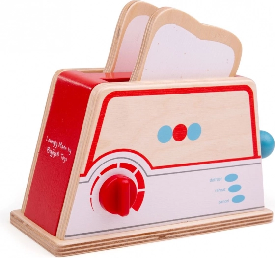 Legen Sie die Brotscheiben in die Schlitze, stellen Sie den gewünschten Bräunungsgrad ein und drücken Sie den Hebel – nach kurzer Zeit springen die Toasts wie bei einem echten Gerät heraus. Die Aufdrucke defrost, reheat, cancel unterstützen das Nachspielen alltäglicher Handlungen und fördern Wortschatz und Vorstellungskraft.