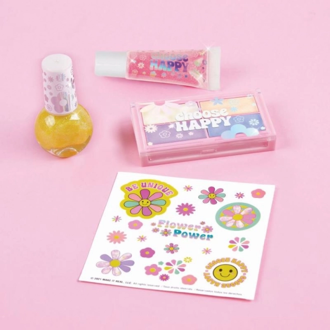 Die Palette mit vier Lidschattenfarben ermöglicht das Kombinieren der Nuancen je nach Stimmung, Nagellack und Lipgloss verleihen dem Look eine dezente Note. Der Stickerbogen erweitert die Gestaltungsmöglichkeiten und fördert die Kreativität.