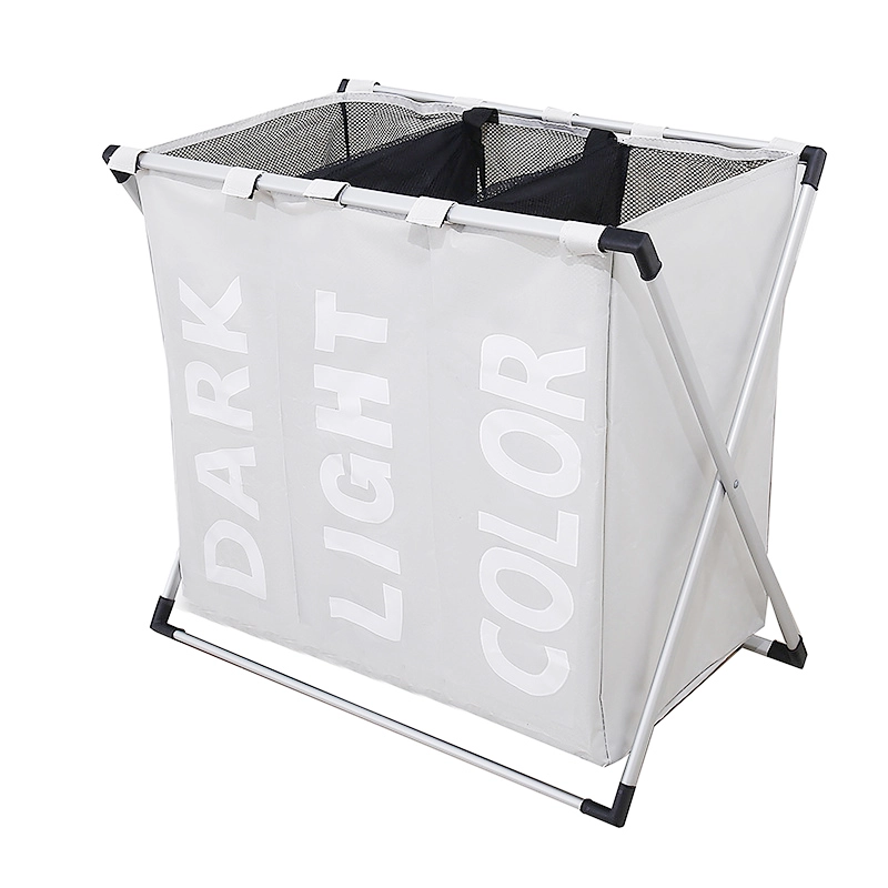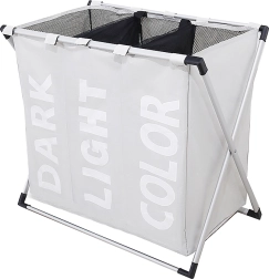 Behalten Sie Ordnung in Waschküche und Haushalt. Dieser dreifache Wäschekorb bietet eine übersichtliche Sortierung in dunkle, helle und bunte Stücke und spart so Zeit vor dem Waschen. Wasserabweisende Textilbeutel verhindern das Eindringen von Feuchtigkeit, und der stabile, dennoch leichte Aluminiumrahmen sorgt für Standfestigkeit im täglichen Gebrauch.