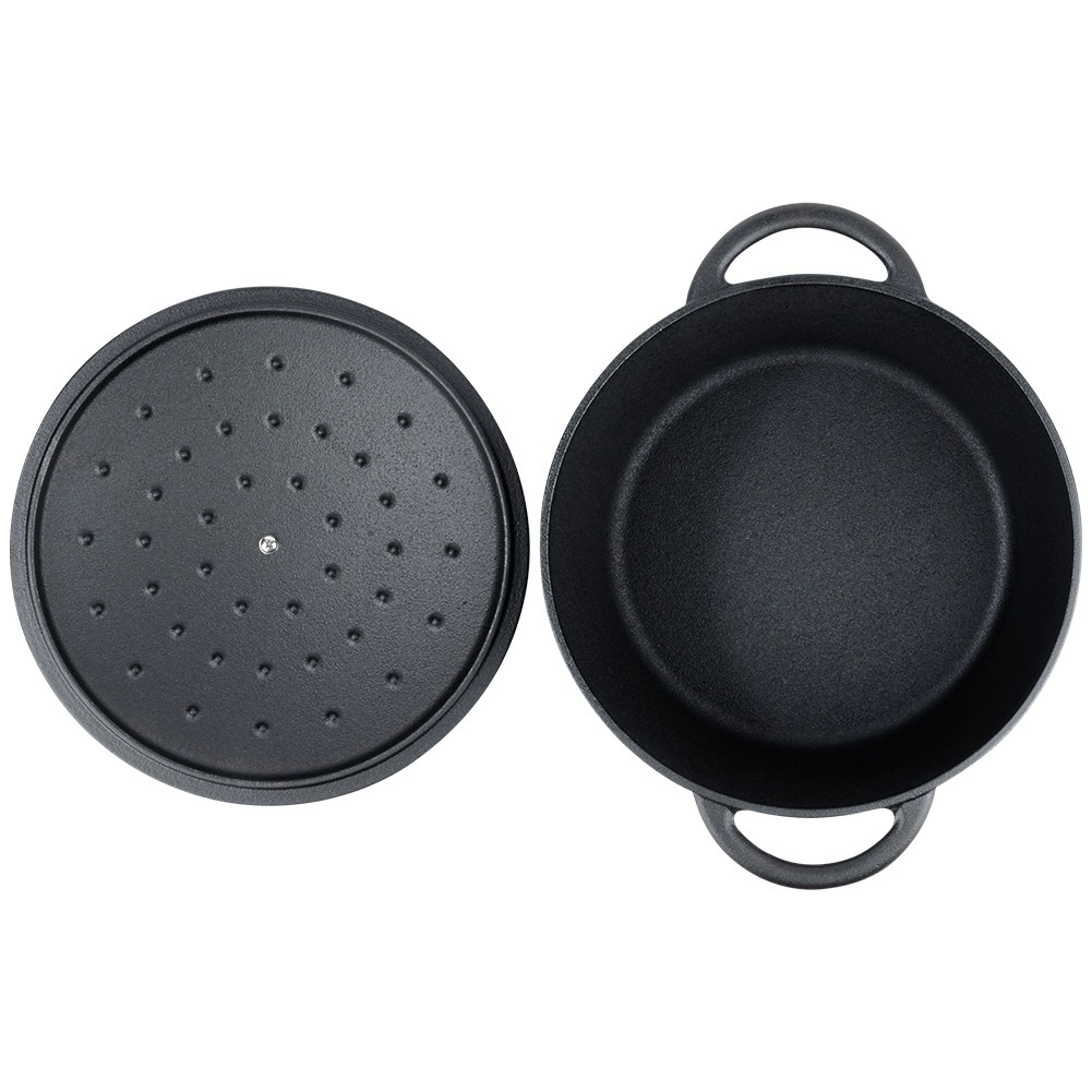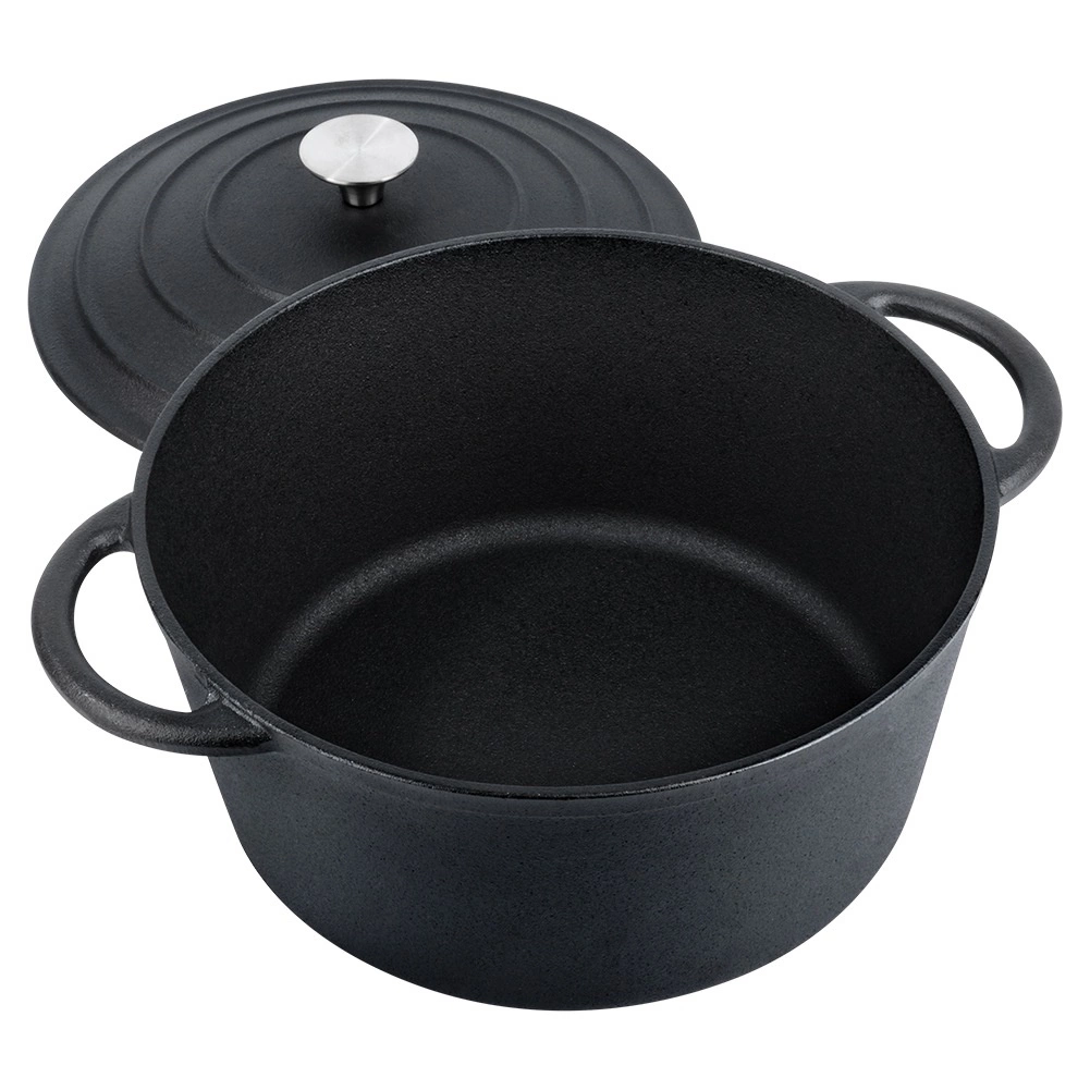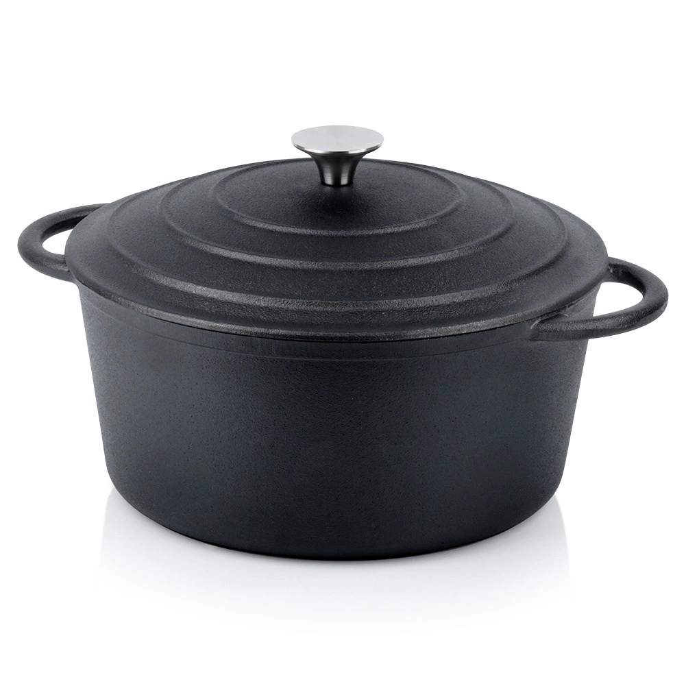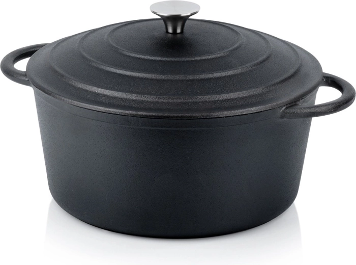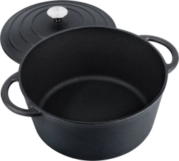 Robuster Gusseisentopf mit Deckel und 5 l Fassungsvermögen für tägliches Kochen, Schmoren und Backen. Bietet gleichmäßige Wärmeverteilung, lange Wärmespeicherung und vielseitige Verwendung auf allen Herdarten sowie im Backofen. Breite Griffe und ein Edelstahlgriff am Deckel sorgen für sicheres Handling.