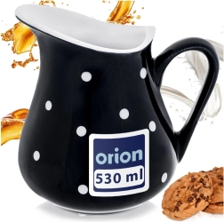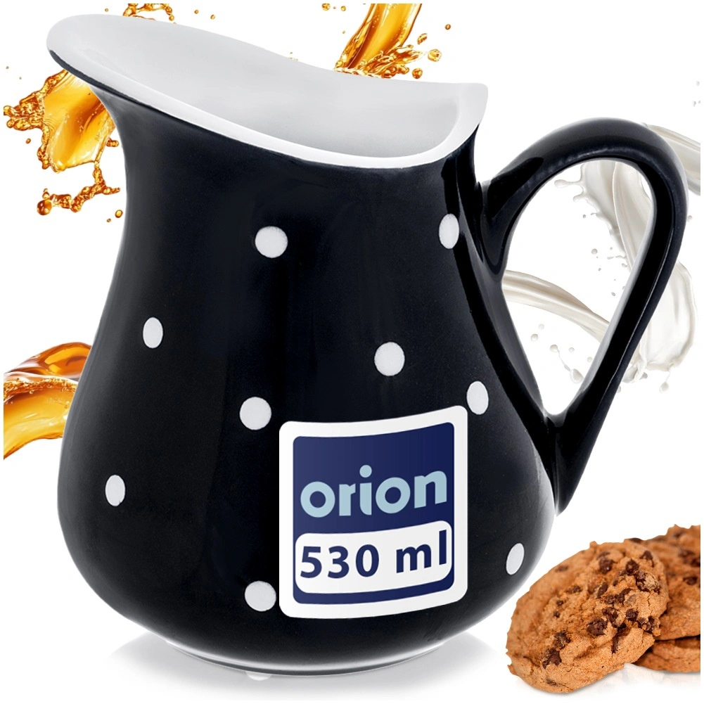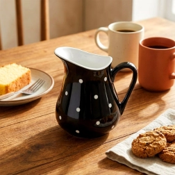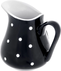 Dieses praktische und stilvolle Kännchen verbindet Funktionalität mit attraktivem Design. Hergestellt aus hochwertiger Keramik in Schwarz mit weißen Punkten, ergänzt es perfekt jedes Frühstück, jeden Kaffeetisch und auch die Festtafel. Dank des universellen Volumens von 480 ml eignet es sich für Milch, Sahne, Saucen und erfrischende Getränke.