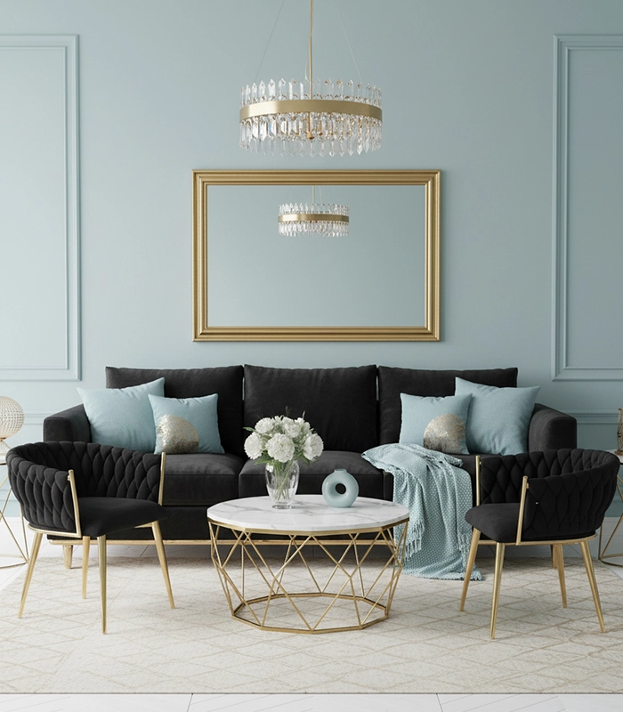 Weicher, angenehm anzufassender Stoff in tiefem Schwarz verleiht dem Interieur moderne Eleganz und einen luxuriösen Charakter. Ideal für stilvolle Ess- oder Gesellschaftsbereiche.