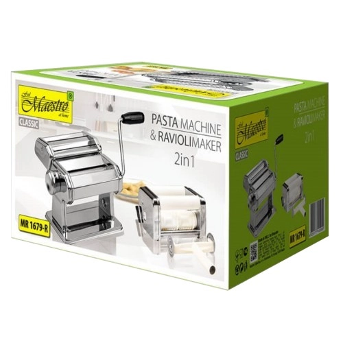 Entdecken Sie die hausgemachte Pasta-Herstellung mit der 3-in-1 Handmaschine Maestro MR-1679R aus Edelstahl. Walzt mühelos Teigbahnen für Lasagne, schneidet Nudeln 2 mm und 6,5 mm und formt dank Ravioli-Aufsatz (4,5 × 4,5 cm) gleichmäßige Täschchen. Bietet 9 Stufen der Teigdicke (0,3–3 mm) und eine Teigbreite bis zu 14,5 cm für perfekte Ergebnisse.