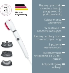 Genießen Sie tiefe Entspannung mit dem Massagegerät MG44, das Vibrationsmassage und optionale Infrarotwärme kombiniert. Dank der um 180° drehbaren Massagekopf, dem verstellbaren Griff und 3 austauschbaren Aufsätzen lösen Sie mühelos verspannte Muskeln am Rücken, Nacken, an den Schultern, Armen und Beinen.
