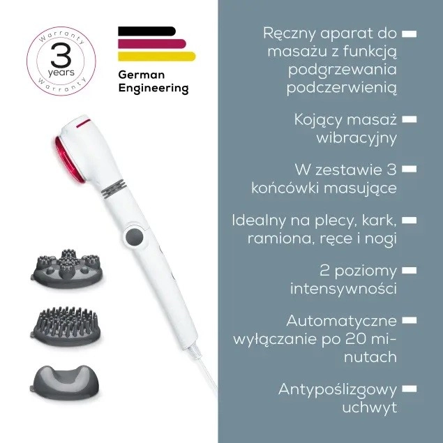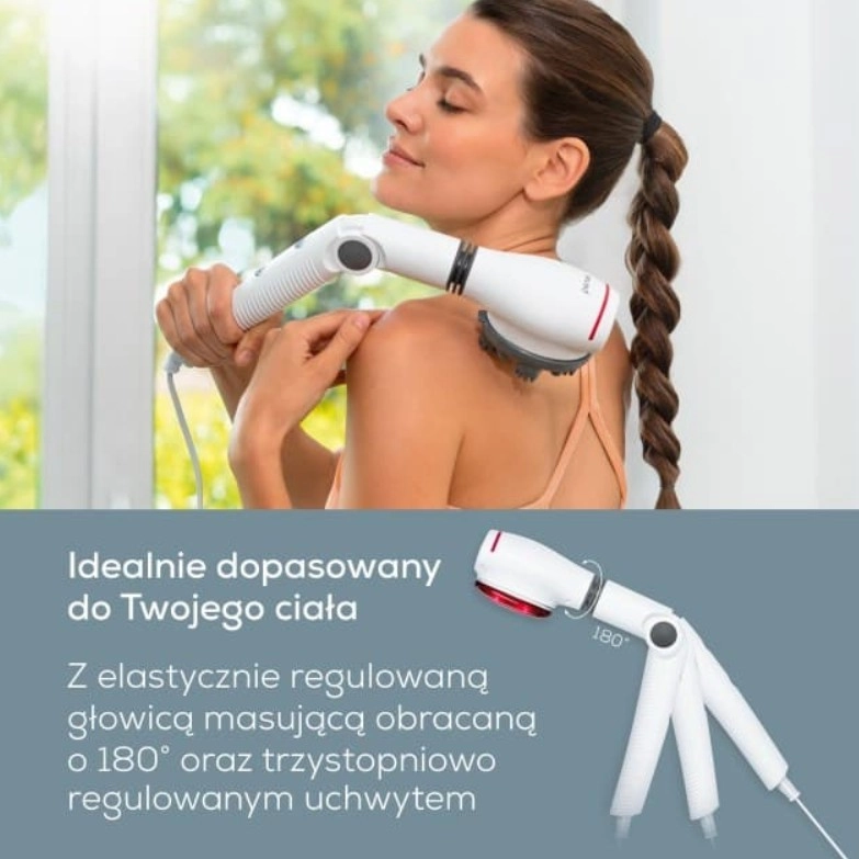 Dank der großen Massage- und Wärmefläche und des um 180° drehbaren Kopfes erreichen Sie auch schwer zugängliche Stellen. Drei hochwertige Massageaufsätze ermöglichen es, die Massage Ihren Bedürfnissen anzupassen – von flächig bis punktuell.